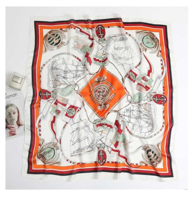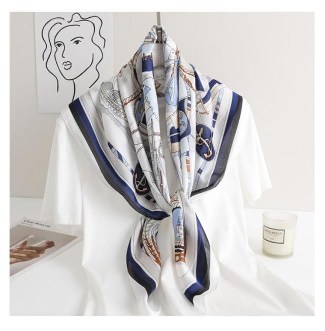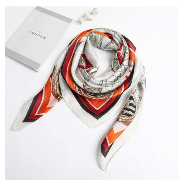 | 正方形の万能スカーフ。 辺約90cmの大判サイズなので、ストールやベルトがわりにしてみたり、バッグに結んだり、アレンジ自由自在でオシャレの幅が広がります。 ストール・ショールのようにも使えます。 シルクタッチのある滑らかな生地です。 | |