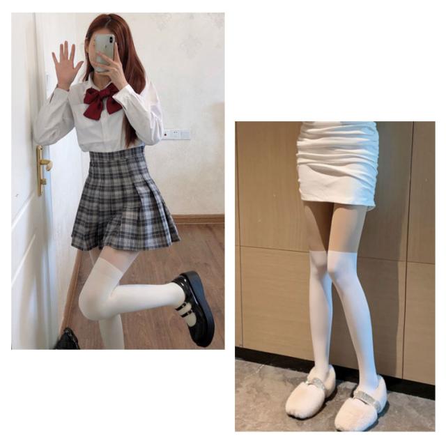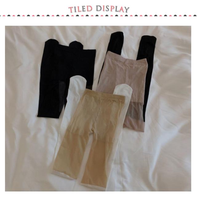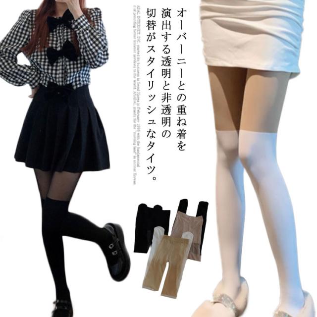 | オーバーニーとの重ね着を演出する透明と非透明の切替がスタイリッシュなタイツ。 太もも上の部分が薄手で透明感のあるストッキング、それより下の部分はタイツになっています。 切替で脚をすっきり見せてくれるのがポイント! フェイクオーバーニーハイで、美脚や脚長効果も期待できます。 | |