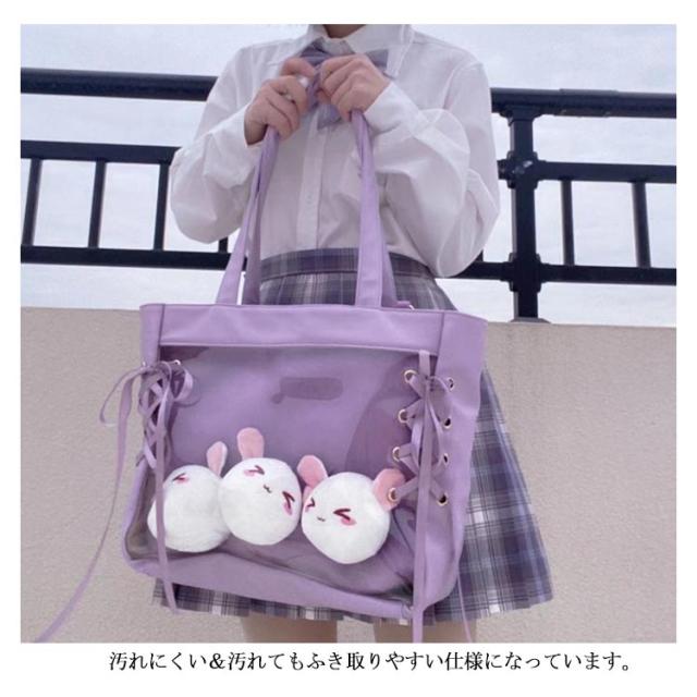 | お好きなデコレーションや缶バッジなど透明なポケット内側に付くことができます。 透明の部分はPVCの材質で、バッグの表はPUで、内側は帆布の材質で組み合わせます。 化粧品、財布、A4紙などを入れられる安心の大容量サイズです。 推し活、ライブ、イベント、普段のお出かけはすごく適用しています。 かわいいリボンも付いてますので、女の子の中で大人気です。 汚れにくい&汚れてもふき取りやすい仕様になっています。 | |