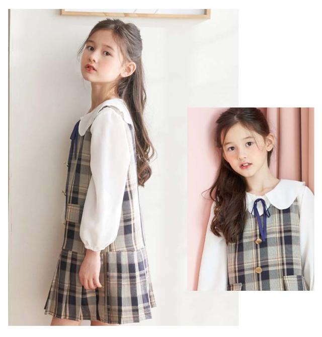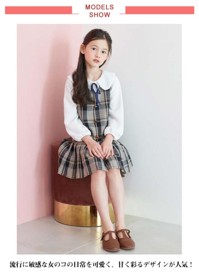 ジャンスカ ドッキング ジャンパースカート 女の子 ブラウス 丸襟 チェック ワンピース セットアップ 長袖 プリーツスカート カットソー ブラウス リボン付き 送料無料 フォーマル 白シャツ 子供服 キッズ 2点セット