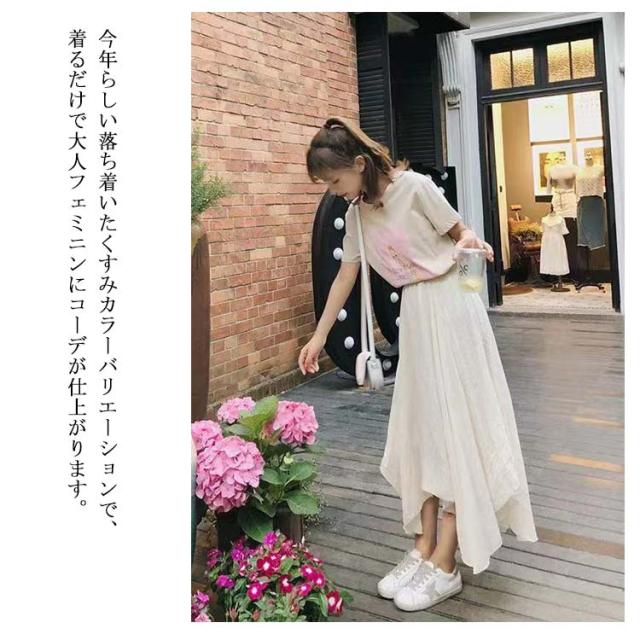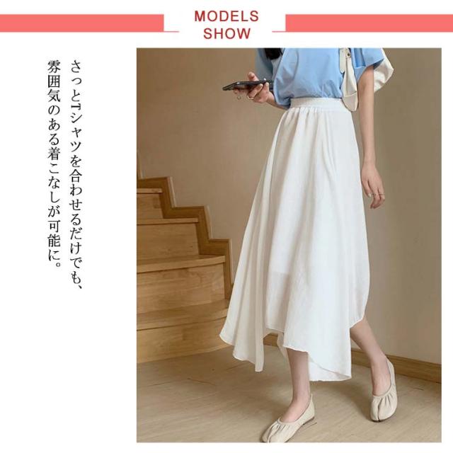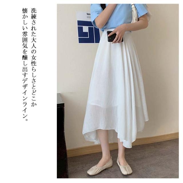 | 上品な軽やかさを意識したアシンメトリーなフレアスカート。 さっとTシャツを合わせるだけでも、雰囲気のある着こなしが可能に。 ウエストゴムでストレッチが効いていますので穿き易いのも嬉しいポイントです。 洗練された大人の女性らしさとどこか懐かしい雰囲気を醸し出すデザインライン。 柔らかな質感と軽く、雰囲気たっぷりに揺れる。動きやすいから着心地はバツグン。 今年らしい落ち着いたくすみカラーバリエーションで、着るだけで大人フェミニンにコーデが仕上がります。 裾に向かって広がる不規則裾をチラ見せすればペチコートとしても活躍! | |