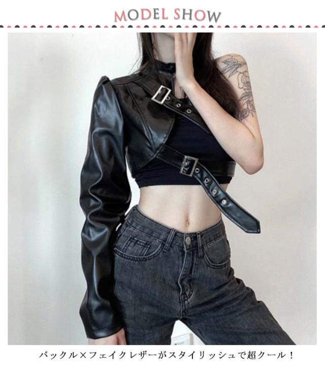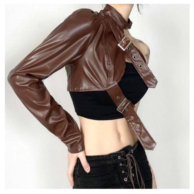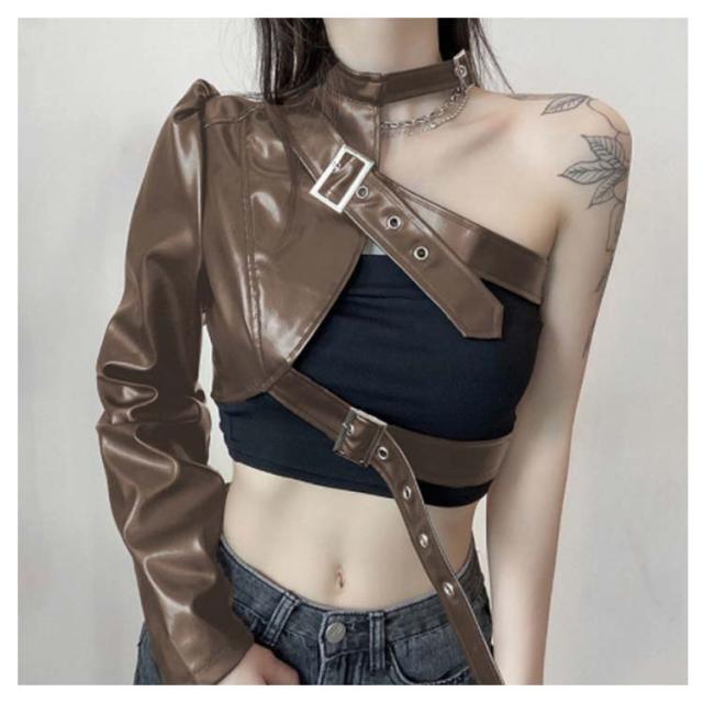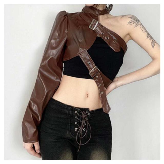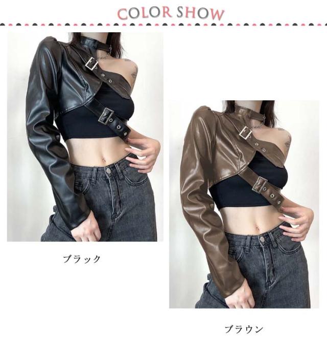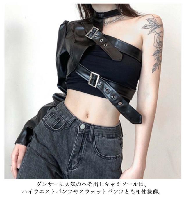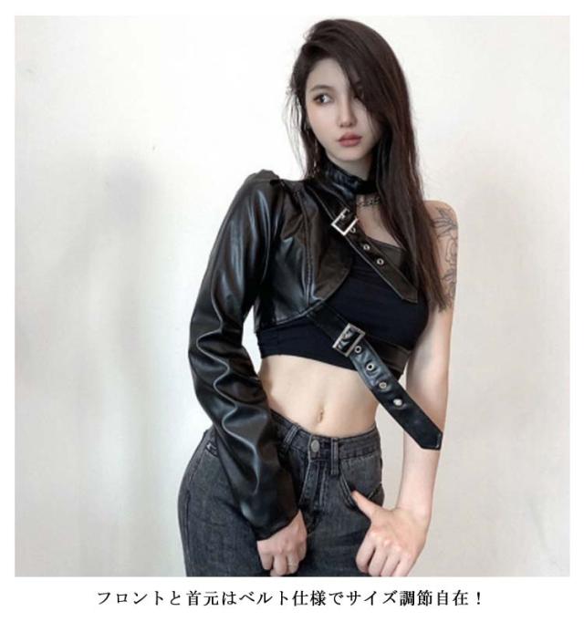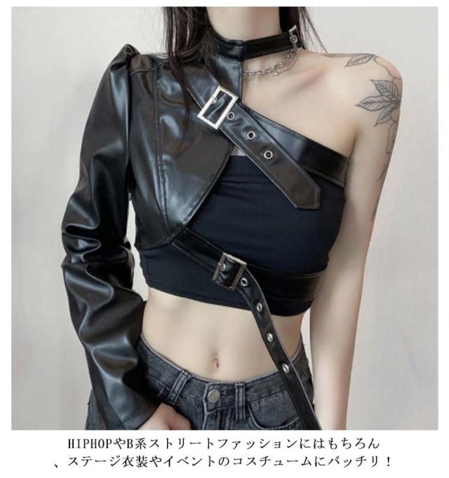 長袖 ワンショルダー ショート丈 レディース ヒップホップ 片腕 無地 ジャケット レザージャケット フェイクレザー ジャケット アウター ダンス衣装 へそ出し ロック オシャレ ダンスウェア ベルト付き パンク ストリート B系 セクシー かっこいい ヘソ出し
