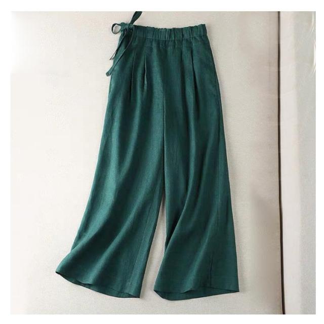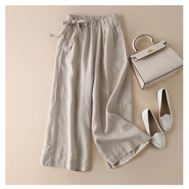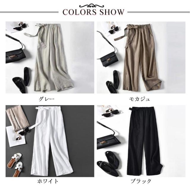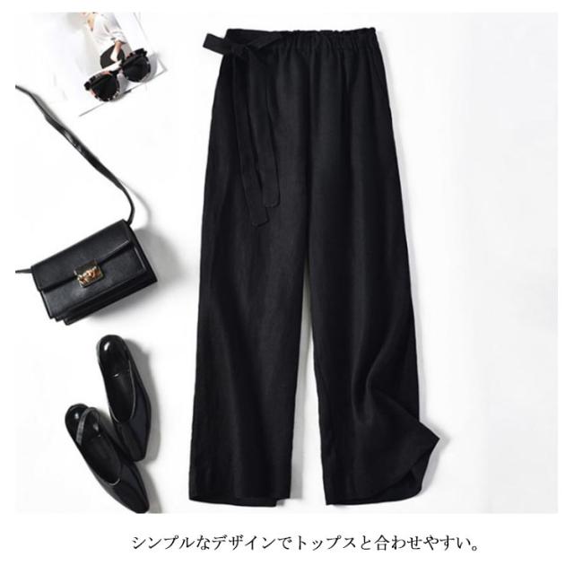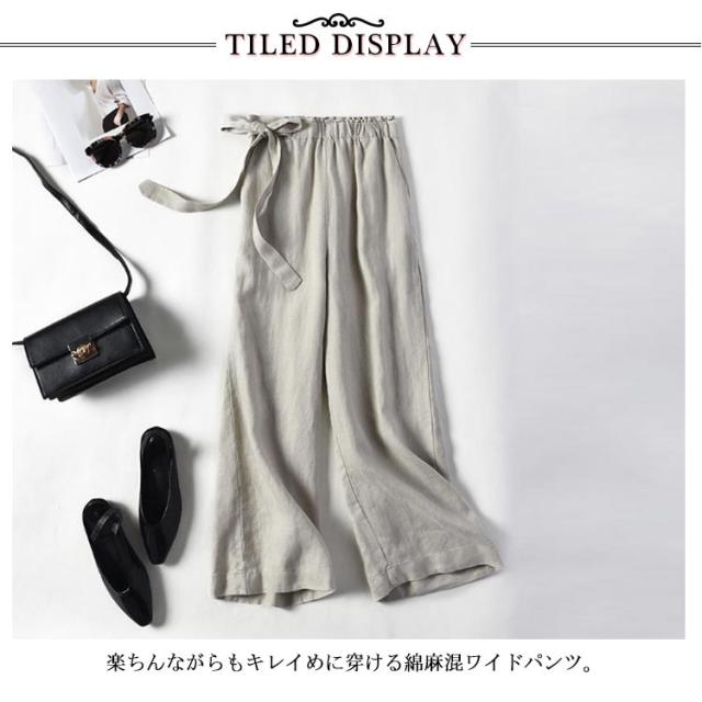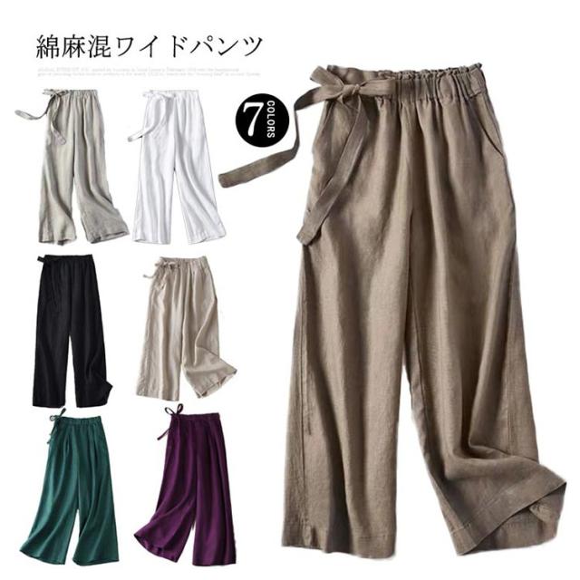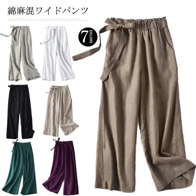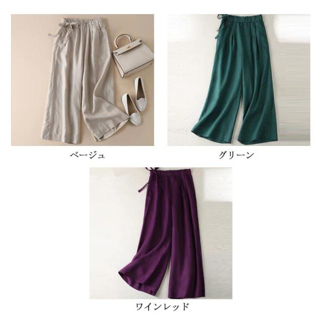 綿麻ワイドパンツ パンツ ボトムス リネン混 スカーチョ 送料無料 九分丈 ストレッチ リボン付き ガウチョパンツ ストンとした落ち感 接触涼感 綿混パンツ レディース