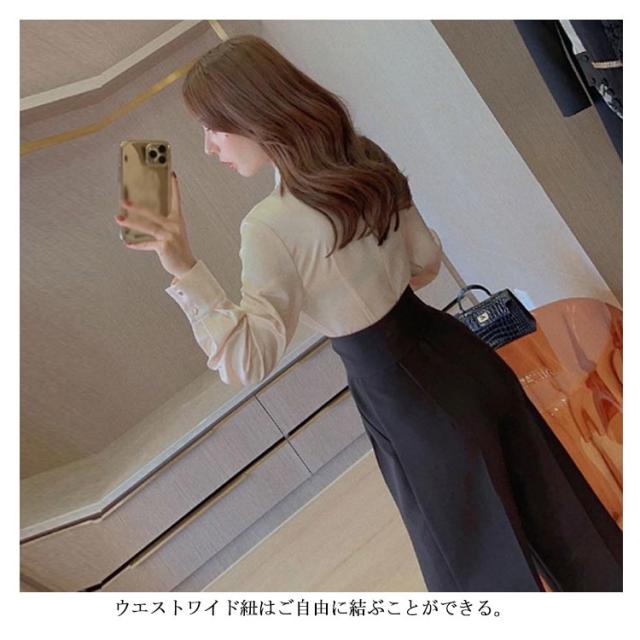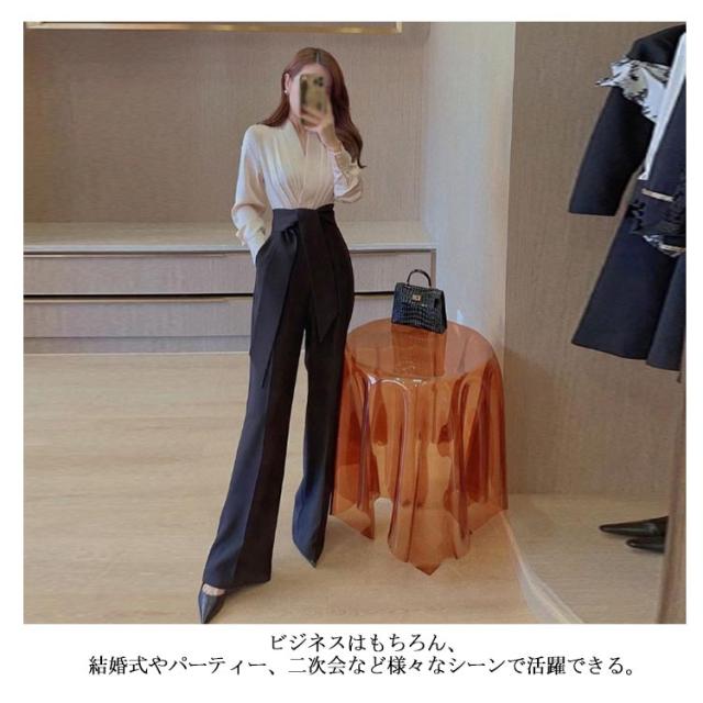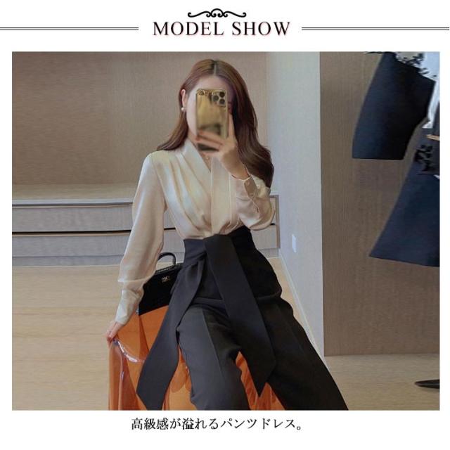 | 高級感が溢れるパンツドレス。 ブラウスはシルクのような感触で着心地が抜群。 ウエストワイド紐はご自由に結ぶことができる。 ビジネスはもちろん、結婚式やパーティー、二次会など様々なシーンで活躍できる。 | |
