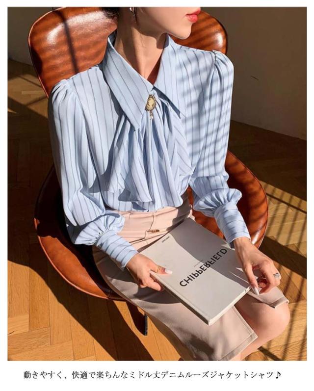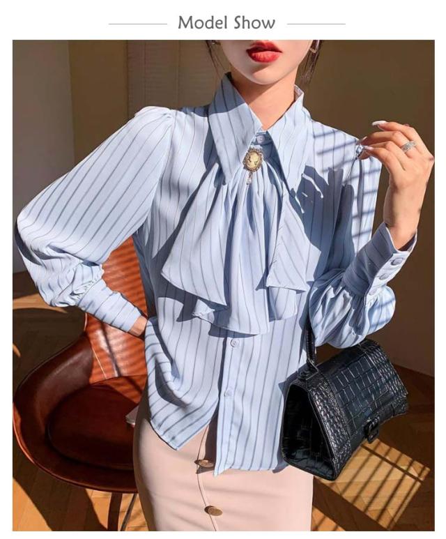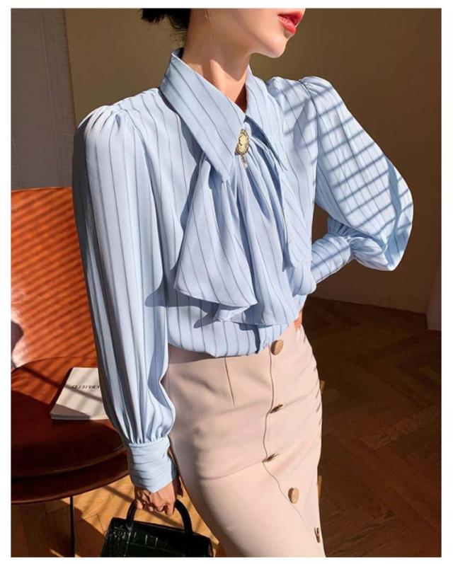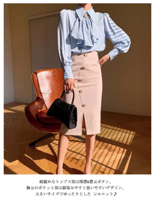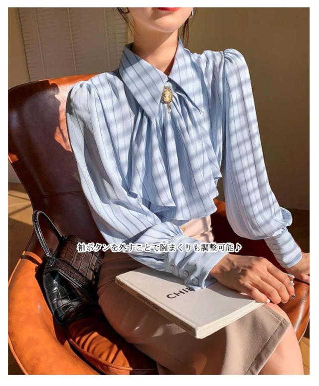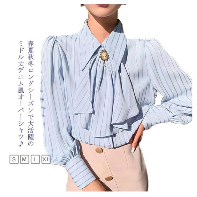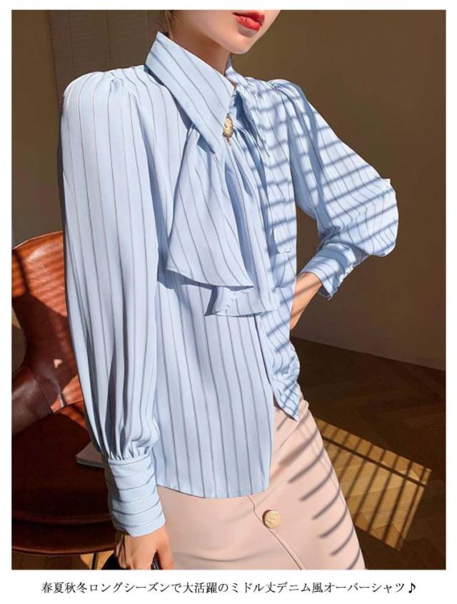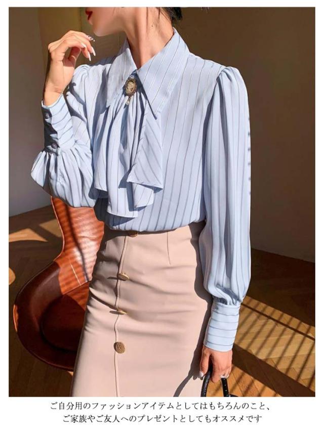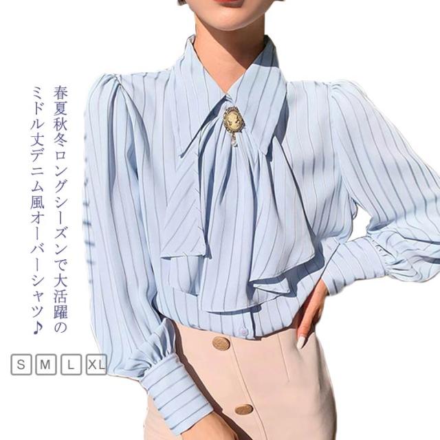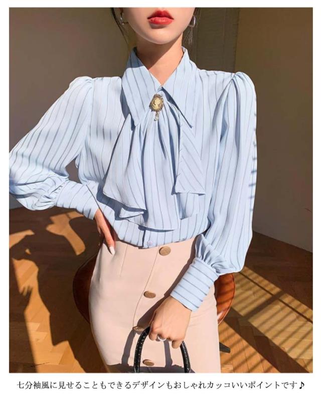 送料無料 ストライプ レディース ブラウス トップス オフィス ストライプシャツ 前リボンシャツ シンプル カジュアル 長袖 シャツ きれいめ 上品 通勤 大人 20代 30代 40代 秋物 春物 リボン付け