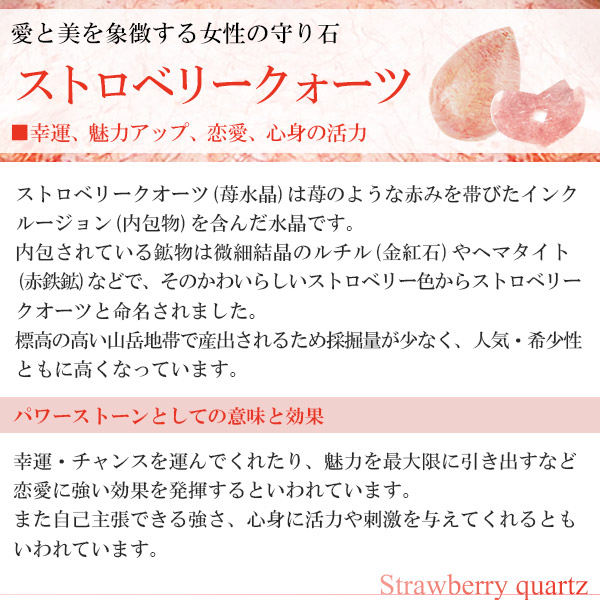 ストロベリークォーツは、内包物を持つ水晶のなかでも、イチゴを彷彿とさせるピンク〜赤色の水晶につけられた流通名です。