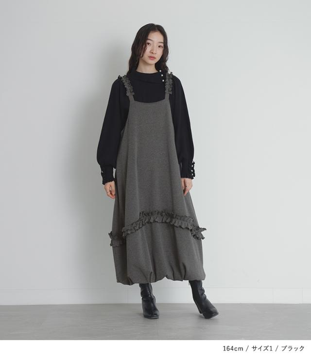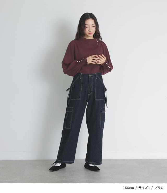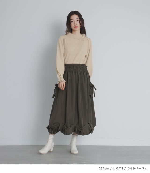 『フェイクパール付きフリルリブニット』【メール便不可】【20】[ニット レディース 秋冬 トップス 長袖 折り返し襟 ぽわん袖 リブ編み フリル フェイクパール セーター]