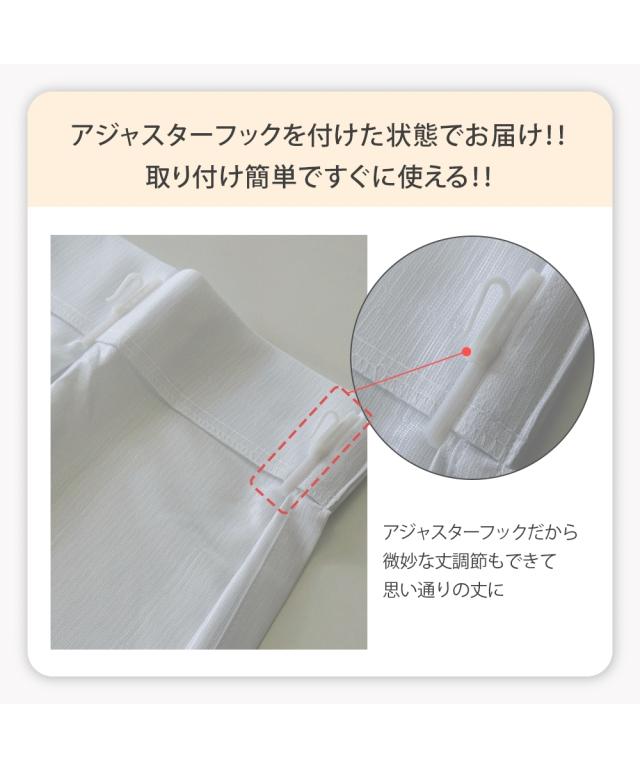 ●セット内容:幅100・150cm=2枚セット、幅200cm=1枚 ●品質:ポリエステル100% ●紫外線カット率=68% ●アジャスターフック付 ※幅100cm以外の商品は継ぎ目が入ります。 【アジャスターフックとサイズ表記についてのご注意】 ※長さが微調整できるアジャスターフック付き(カーテンレールが見えるタイプ=Aフック) ※サイズ表記に記載されている長さは、「フックを引っかける部分(カーテンレールのリング下)から裾までの長さ」となり、総丈はサイズ表記の長さより約1cm長くなります。 詳しくは詳