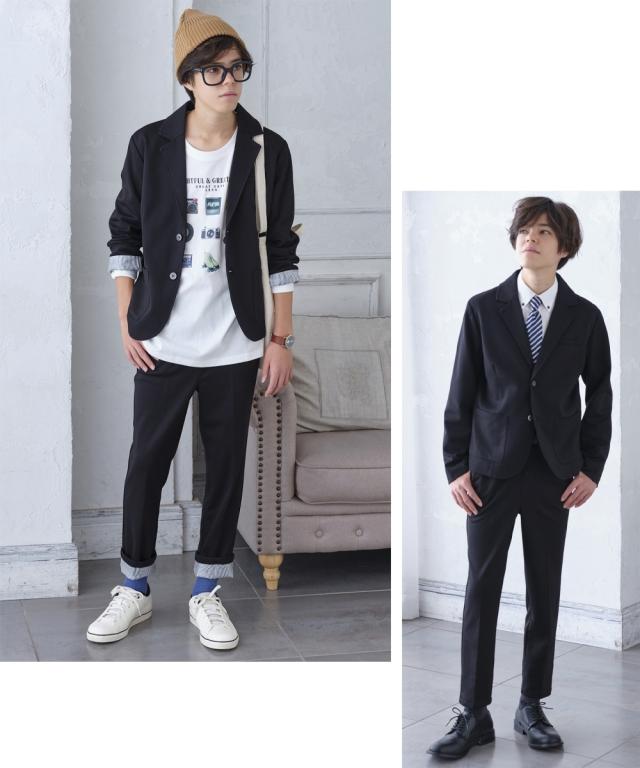 インナーを自由に選んで自分スタイルの完成!大人スタイルのセットアップスーツ☆裏地がストライプ柄でチラッと見えるのがカッコイイポイント☆インナーには定番のシャツはもちろん、Tシャツでもカッコイイ☆オシャレキッズにおススメのフォーマルスーツ☆