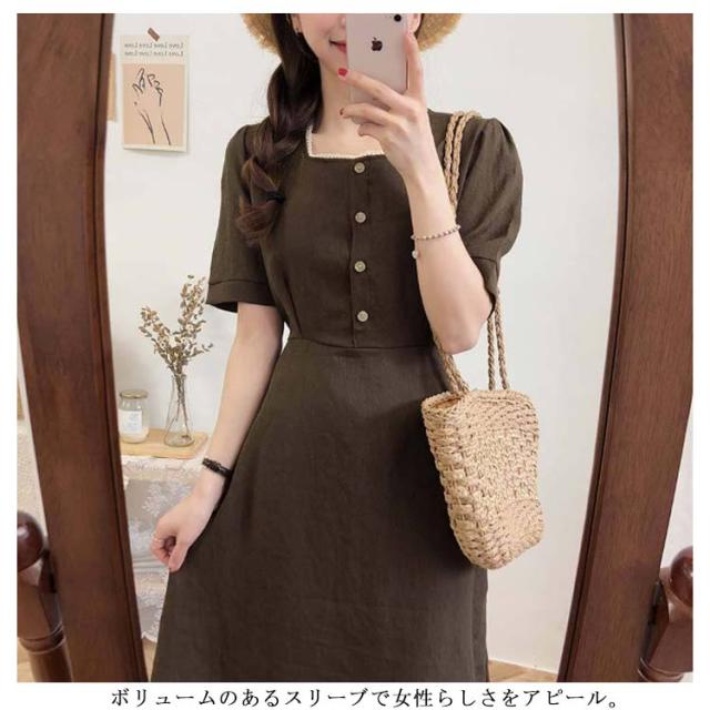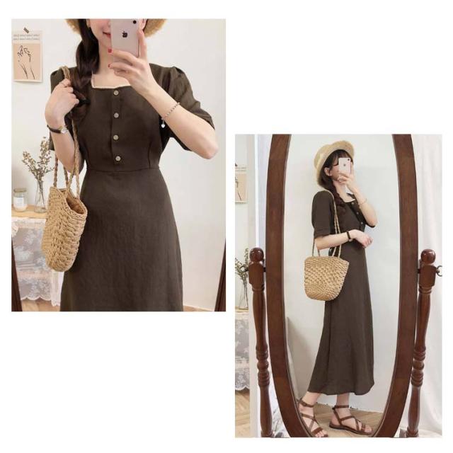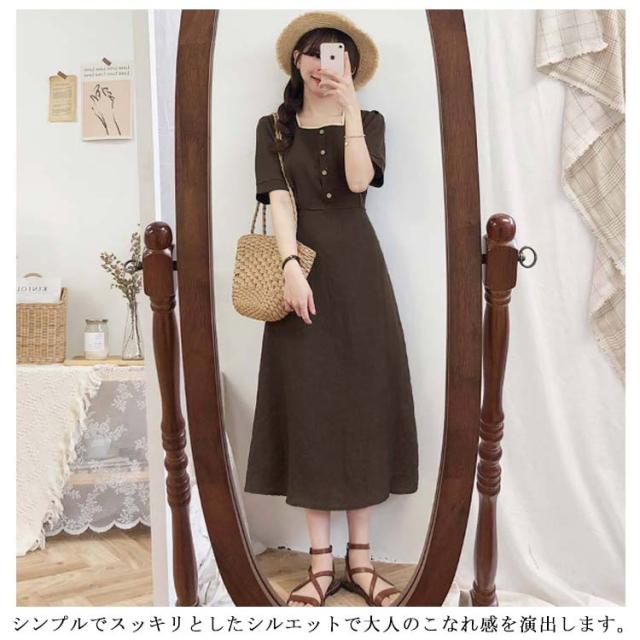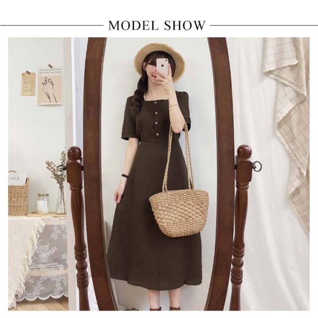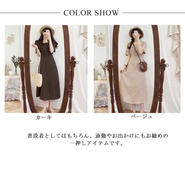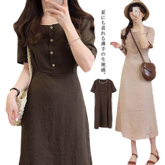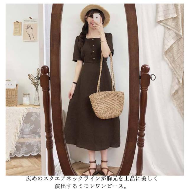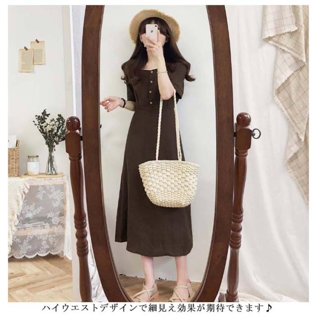 送料無料 レディース ワンピース スクエアネック パフスリーブ 半袖 ミモレ丈ワンピース ロング丈 ハイウエスト トレロ 可愛い ナチュラル 森ガール Aライン フレア 無地 上品 夏物 清楚 オフィス お出かけ 普段着 韓国スタイル おしゃれ