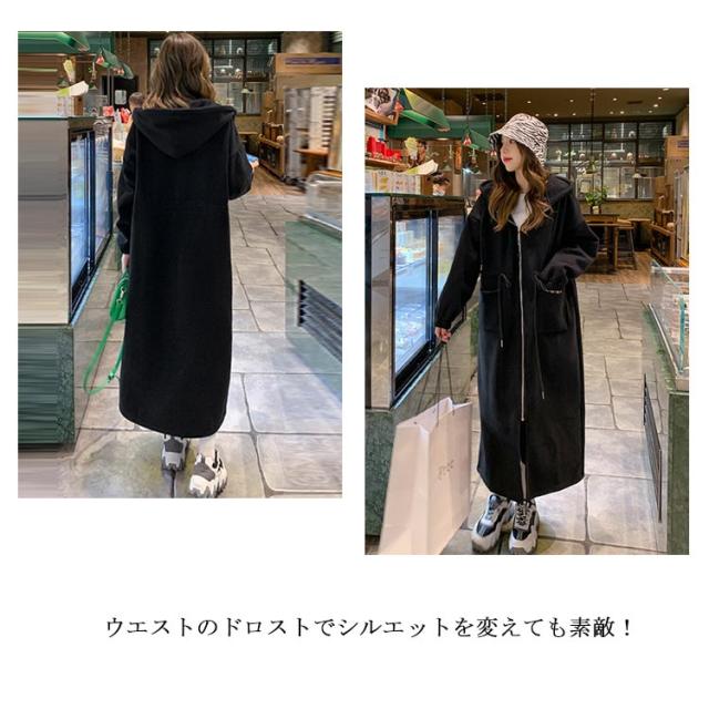 | 裏起毛で暖かいロングアウター☆ 気軽には羽織れるのはポイント、1枚だけでもオシャレに見える! ウエストのドロストでシルエットを変えても素敵! フードとポケットが付いていますのでディリー使いに便利です♪ | |