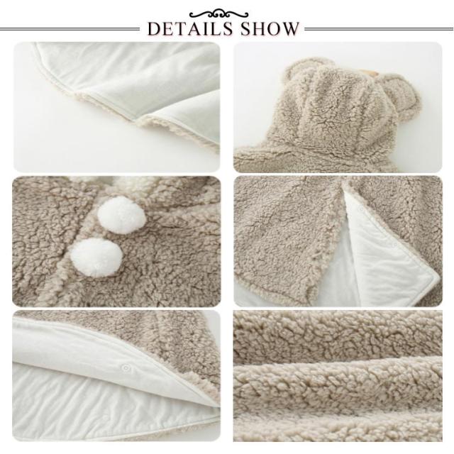 | 思わず笑顔になる、ふわふわアニマルのベビーマントです。 ボアフリース素材で丁寧に仕立て、ふんわりあったかい着け心地です。 両脇のボタンを留めるとお袖を通すことができます。 お子様は動きやすく、体の熱を逃がさず、風の吹き込みを軽減できます。 | |