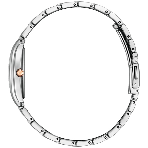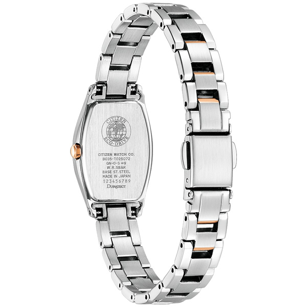 華奢でエレガントな長角ケースのエコ・ドライブモデル。ケースサイドのフローラインがしなやかな女性らしさを表現しています。文字板のインデックスには柔らかい印象のローマ数字を採用。時分秒針の3針なので、時間も見やすく実用的なモデルです。バンドは長さ調整が手軽なシンプルアジャストバンド。