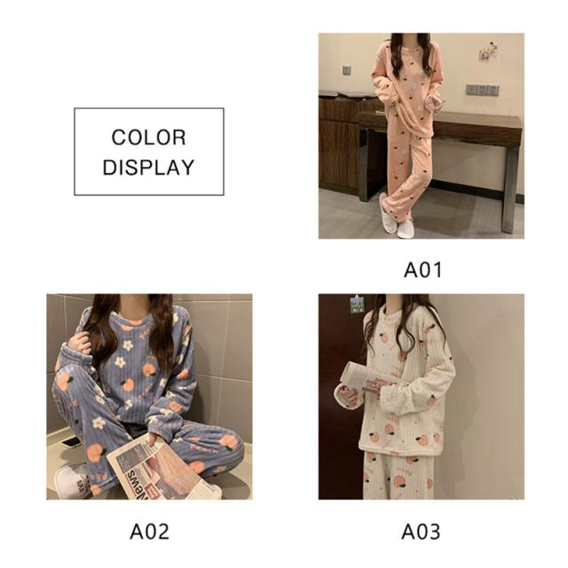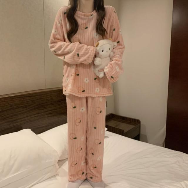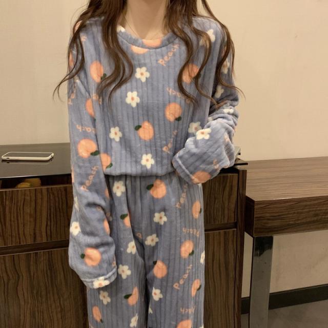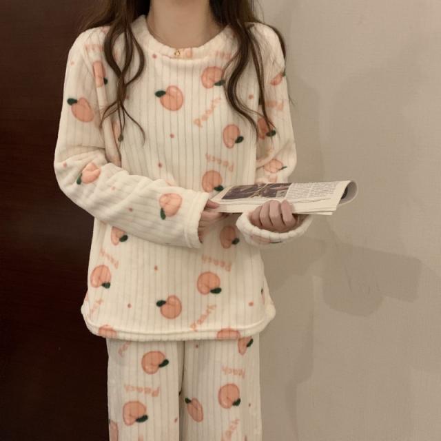 もこもこパジャマ レディース 厚手 ゆったり 果物柄 可愛い 冬 部屋着 長ズボン 長袖 プルオーバー 上下セット ふわふわ 柔ら