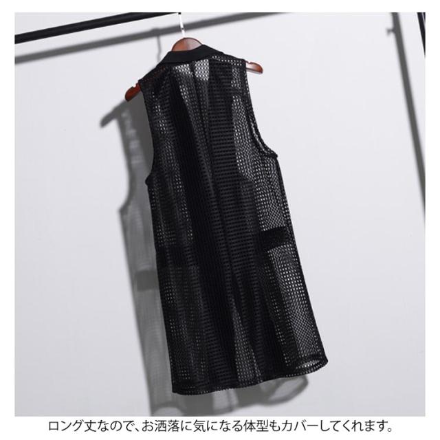 M-4XLサイズ!メッシュ素材 ジレベスト レディース ジレ ベスト ロング丈 羽織 ライトアウター 着やせ 大きサイズ サマー カーディガン ノースリーブ 黒 薄手
