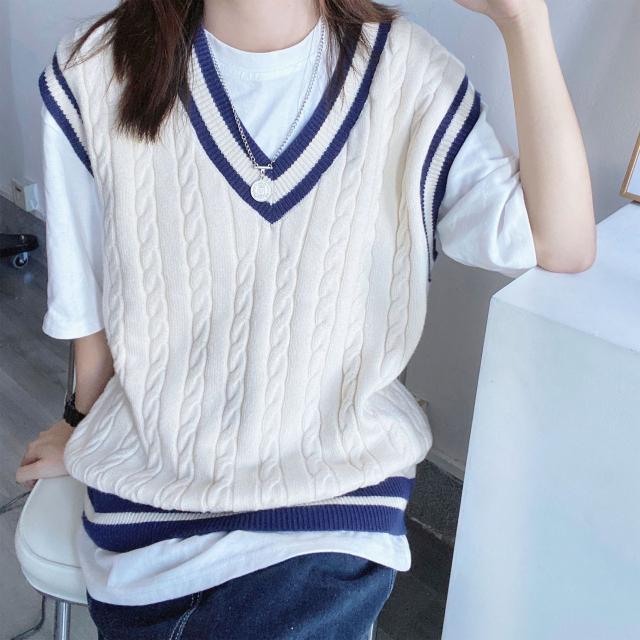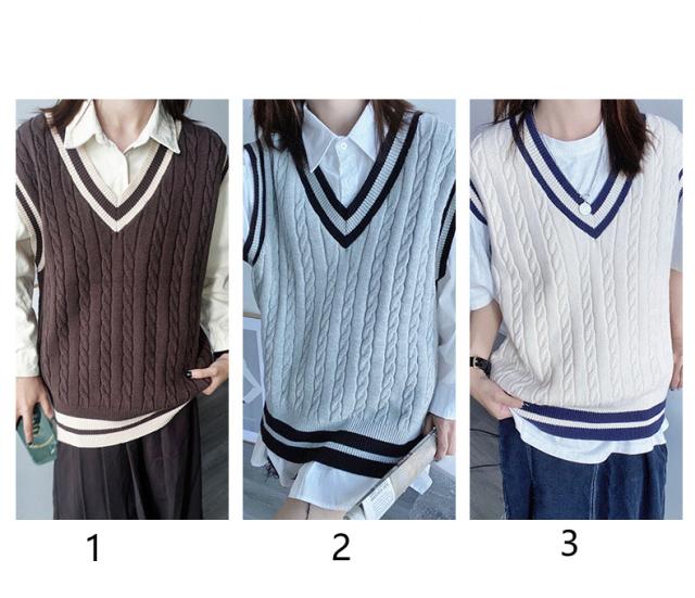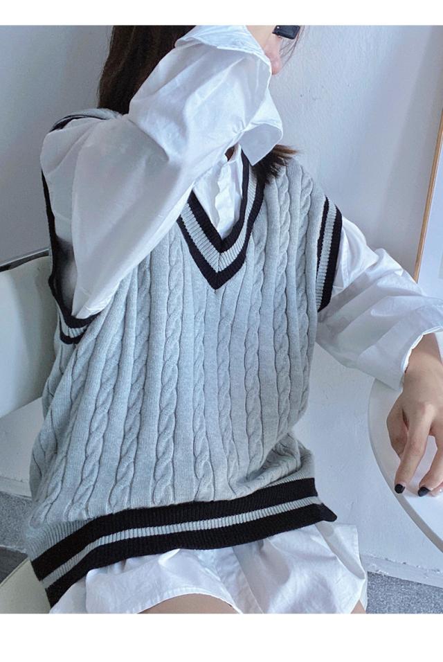 全6色!スクールベスト スクールニット ニットベスト プルオーバーベスト ケーブル編み ニット ベスト Vネック ショート丈 配色ライン レイヤード 春 秋
