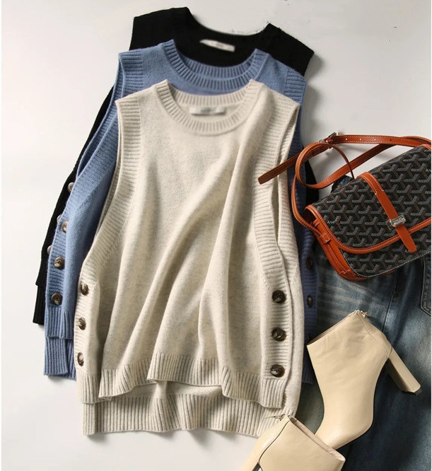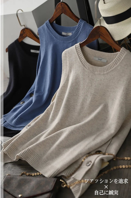 サイドボタン付き ニットベスト レディース ノースリーブニット プルオーバー ニット ベスト 大きサイズ ラウンドネック ゆったり レイヤード カジュアル 春服 秋服 黒 ブルー ベージュ