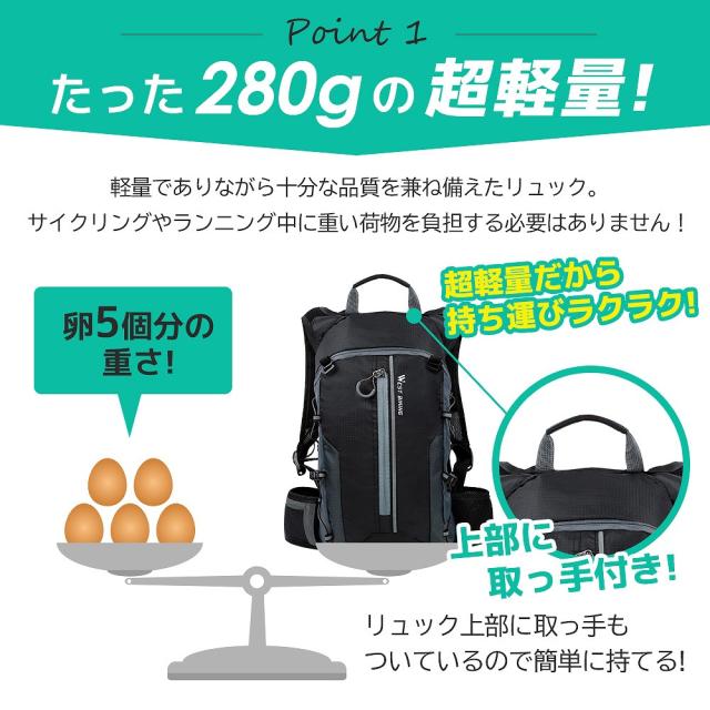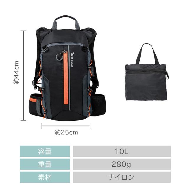 | 商品の説明 | 超軽量で大容量のサイクリングリュック!無駄な部分をそぎ落とし軽量でありながらも、十分な品質を兼ね備えたアウトドア向け万能リュック! 重さはたったの280g!卵5個分の重さ!ランニングやサイクリングにも負担にならない重さです。 しかも折り畳み専用バッグ付きでコンパクトに折り畳んで持ち運ぶことも可能。 そんなに軽量でコンパクトなのに容量10Lの大容量!アウトドアに必要なものもしっかり収納できます。 背面部分は通気性の良いメッシュ素材で、汗をかいてもムレにくく気持ちよく使用できます。 反射素材を使用しているので、夜間での視認性もあがり安心。撥水素材なので雨でも中身が濡れにくいです。 運動中には欠かせない水分補給もチューブ付きなので手軽に補給可能。さらにサイド・フロントポケット付きで小物を収納でき両手を空けるられる。リュックを背負いやすくするウエストベルト、ヘルメットを固定できるフック付きでまさにサイクリングだけでなくランニング、アウトドアにも最適! |