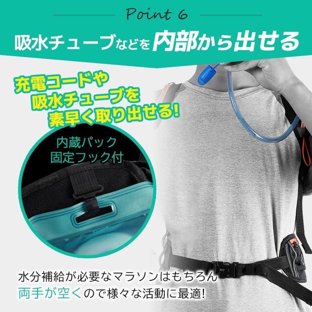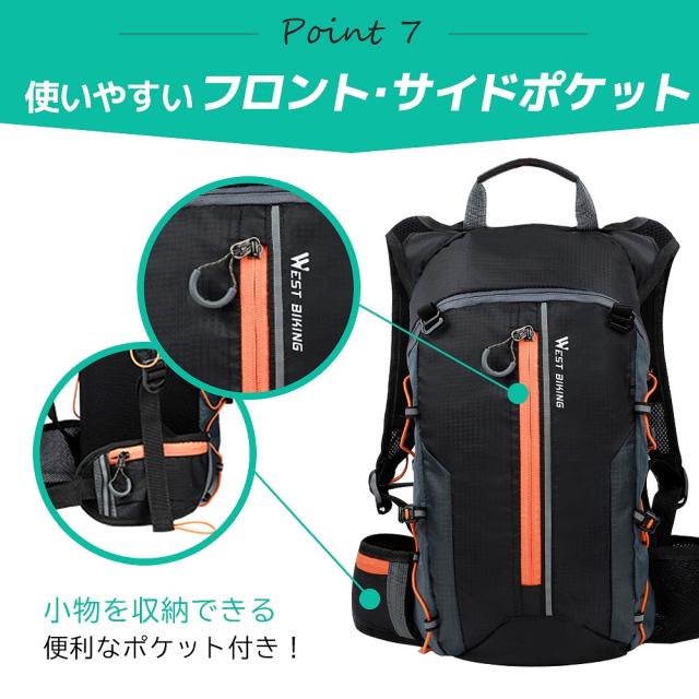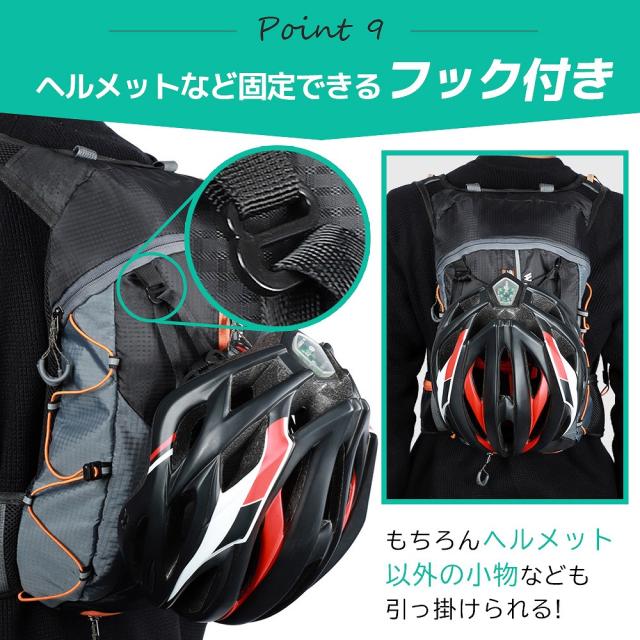 運動中には欠かせない水分補給もチューブ付きなので手軽に補給可能。さらにサイド・フロントポケット付きで小物を収納でき両手を空けるられる。リュックを背負いやすくするウエストベルト、ヘルメットを固定できるフック付きでまさにサイクリングだけでなくランニング、アウトドアにも最適!