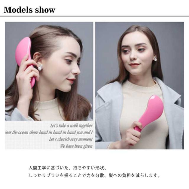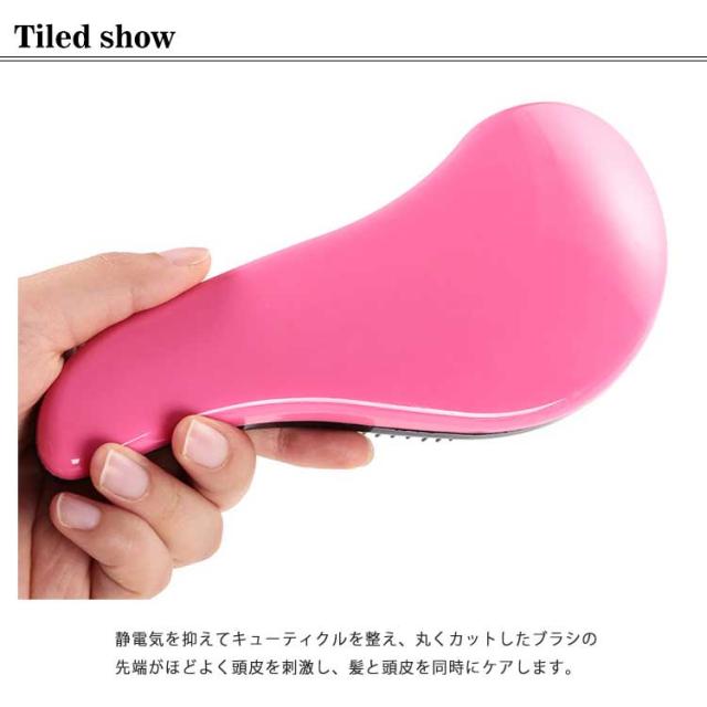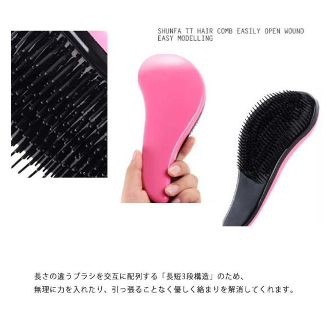 | 絡まない魔法のヘアブラシ! 人間工学に基づいた、持ちやすい形状、しっかりブラシを握ることで力を分散、髪への負担を減らします。 長さの違うブラシを交互に配列する「長短3段構造」のため、無理に力を入れたり、引っ張ることなく優しく絡まりを解消してくれます。 静電気を抑えてキューティクルを整え、丸くカットしたブラシの先端がほどよく頭皮を刺激し、髪と頭皮を同時にケアします。 | |
