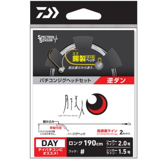 ダイワ DAIWA グローブライド 月下美人 バチコンジグヘッドセット GEKKABIJIN VERTICON JIGHEAD SET / ライン フック 釣り針 メバリング アジング メバル アジ ■バチコン専用ジグヘッド付き胴突きセット仕掛け スイベルにリーダーを結ぶだけ。誰でも簡単に使えるバチコン釣法、胴突き仕掛け(1本針仕様)。 各地のバチコン釣法に最適な選べる「DAY」「NIGHT」2モデルをご用意。 「錫製」ヘッドの月下美人バチコンジグヘッドを採用。 月下美人が提案するバチコンジグヘッドは「錫製」ヘッド。対「鉛」比重は150%と体積が非常に大きくシルエットが大きい故、「潮流の影響を受けやすく」「フォール速度が極めて遅い」。 潮受け効果からワームが泳ぐ姿勢を維持し、アジにじっくりフォール姿勢を見せる事ができる!「釣れる!」を体現できるバチコン専用ジグヘッド付き。 DAYモデル ロング:仕掛け全長170cm フック#8/#6 枝ス2.0号 NIGHTモデル ショート:仕掛け全長140cm フック#8太軸/#6太軸 枝ス2.5号 ■月下美人バチコンジグヘッドセット 逆ダン 編み込み仕掛けだから枝スの長さが自由に変更できる。バチコン釣法、逆ダン仕掛け。 各地のバチコン釣法に最適な選べる「DAY」「NIGHT」2モデルをご用意。 「錫製」ヘッドの月下美人バチコンジグヘッドを採用。 月下美人が提案するバチコンジグヘッドは「錫製」ヘッド。 対「鉛」比重は150%と体積が非常に大きくシルエットが大きい故、「潮流の影響を受けやすく」「フォール速度が極めて遅い」。 潮受け効果からワームが泳ぐ姿勢を維持し、アジにじっくりフォール姿勢を見せる事ができる!「釣れる!」を体現できるバチコン専用ジグヘッド付き。 DAYモデル ロング 仕掛け全長190cm フック#8/#6 リーダー2.0号 NIGHTモデル ショート 仕掛け全長150cm フック#8太軸/#6太軸 リーダー2.5号 ■発売年:2023年 |