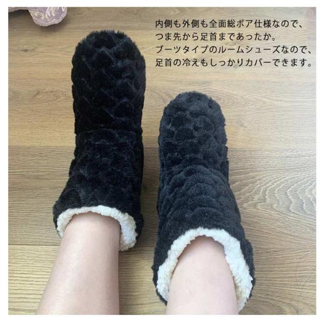 | あったかもこもこルームシューズ。 底面は滑りにくく、柔らかさと耐久性をあわせ持った素材を使用しています。 パタパタと音がしにくい防音設計なので、足音も気になりません。 内側も外側も全面総ボア仕様なので、つま先から足首まであったか。ブーツタイプのルームシューズなので、足首の冷えもしっかりカバーできます。 汚れたら、洗濯ネットに入れて洗濯機で丸洗いが可能です。 | |