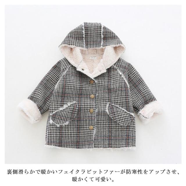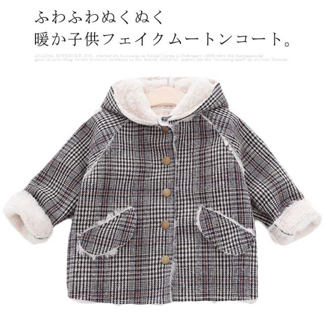 ムートンコート 子供服 女の子 男の子 グレンチェック柄 アウター フード付き ファーコート 裏ボア Pコート 90 100 110 120 130cm