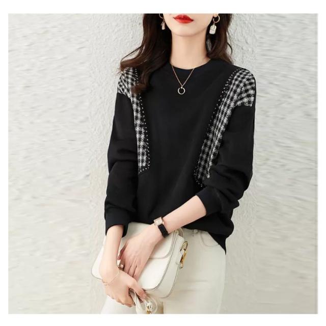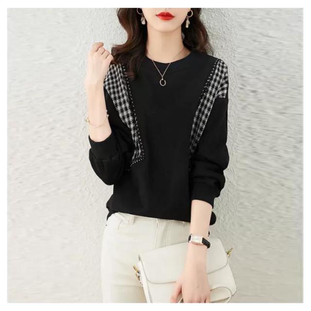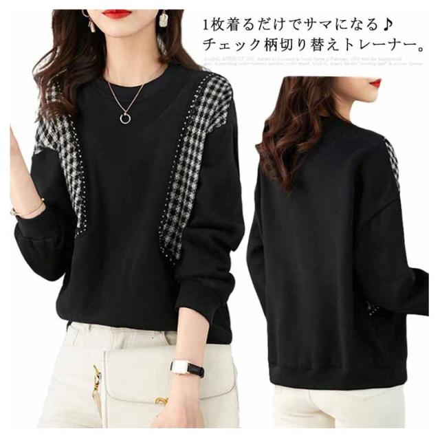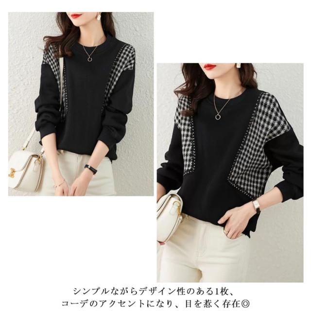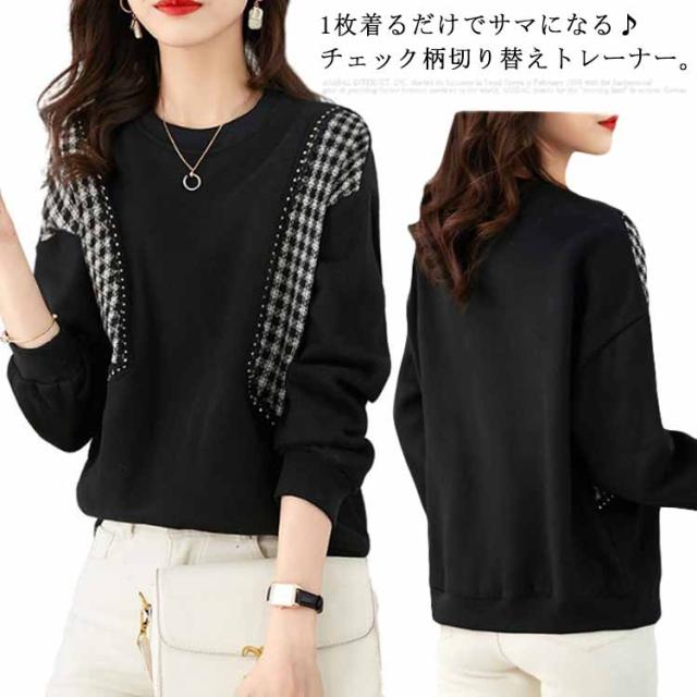 トップス 丸首 トレーナー チェック柄 パーカー レディース チェック柄 切り替え 長袖 着痩せ オシャレ スウェット