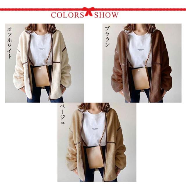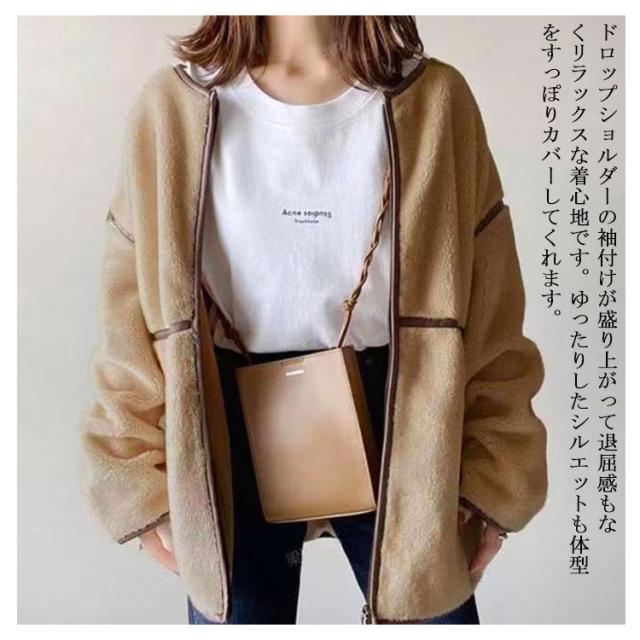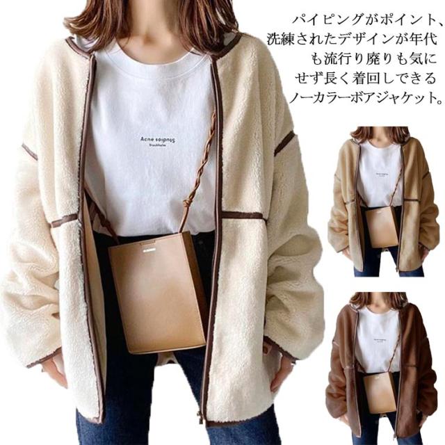 | パイピングがポイント、洗練されたデザインが年代も流行り廃りも気にせず長く着回しできるノーカラーボアジャケット。 柔らかで優しい肌触りで着心地が良く、保温性も優れて快適にご着用いただけるボアコートです。ディリー使いはもちろん、通勤、通学、旅行、お出かけ、アウトドアなど幅広く活躍します。 ドロップショルダーの袖付けが盛り上がって退屈感もなくリラックスな着心地です。ゆったりしたシルエットも体型をすっぽりカバーしてくれます。 ノーカラーなのでハイネックのニットとの相性抜群! バランスの取りやすいミディ丈でパンツスタイルにも、ロングスカートなどいろんなボトムと合わせやすく、着回し力バッチリ! | |