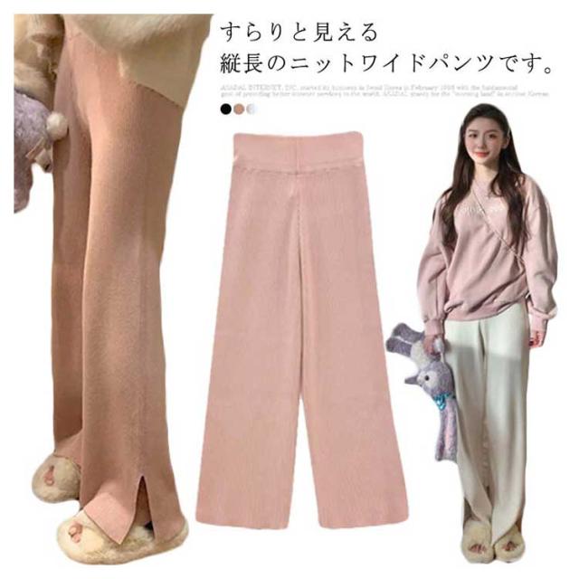 秋冬 スリット ニットパンツ レディース リブニット ワイドパンツ フレアパンツ ハイウエスト 大きいサイズ 体型カバー ハイウエスト