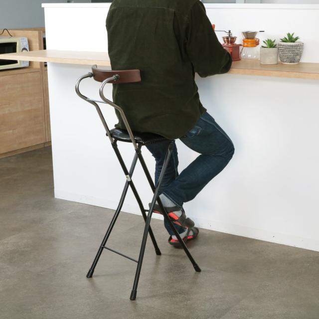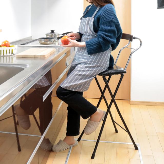 座面高約73.5cmのチェアは、ハイカウンターテーブルなど少し高めのテーブルに合わせやすく、キッチンのちょっとした腰掛けに使いやすいサイズ感です。折りたたみ可能で使用しない時はコンパクトに収納でき、急な来客時の簡易チェアにもピッタリでとっても便利です。