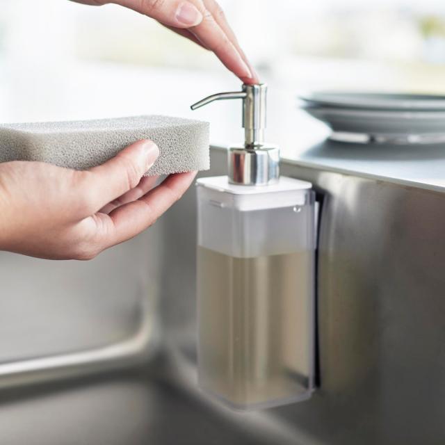 壁面につけたままポンプを押せます。そのままプッシュして使えるから、キッチンでの洗い物や洗面所のハンドディスペンサーにも最適です。