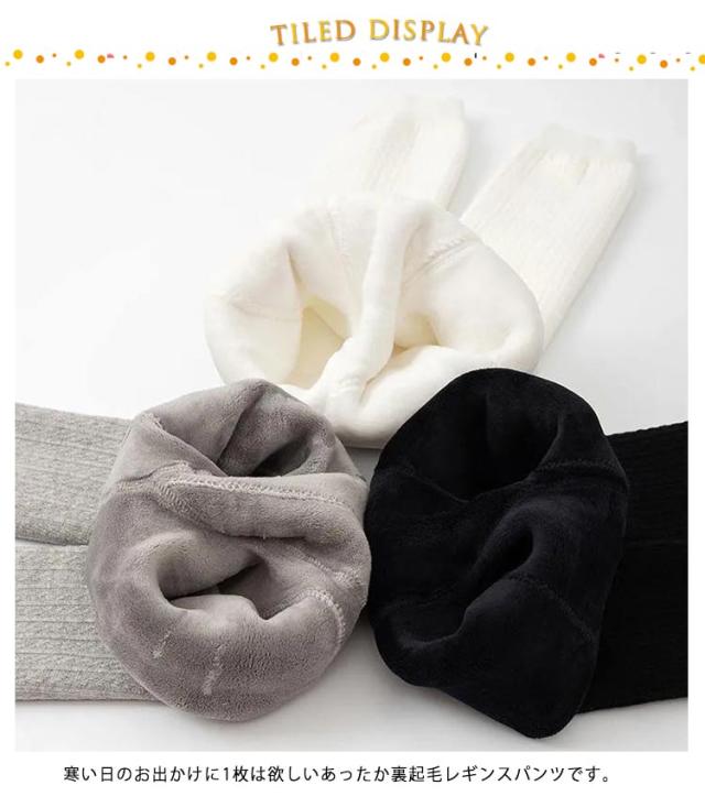 | 裏地はゴムと裾の部分をのぞいてすべて起毛!寒い日のお出かけに1枚は欲しいあったか裏起毛レギンスパンツです。 抜群の伸縮性でお外遊びにもおうち時間にもストレスフリーで快適に過ごせます♪ らくちんウエスト総ゴムなのでお着替えも簡単! 毎日のお着替えに、通園通学、お外遊びにおうち時間…どんな場面でも大活躍すること間違いなし!の便利な1枚です! | |