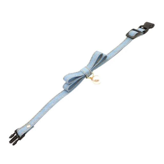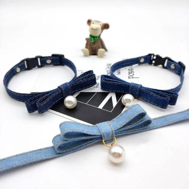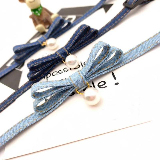 2点セット 首輪 猫 犬 小型犬 デニム 犬 首輪 おしゃれ ネコ 首輪 いぬ イヌ ねこ キャット リボン チョーカー くびわ ペットグッズ ベル付き 鈴付き パール アクセサリー XS S M L ブルー 送料無料 幅1cm