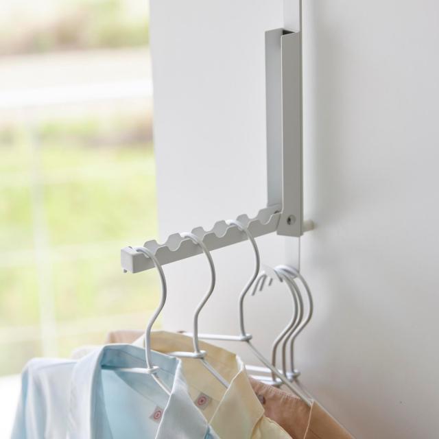 手軽にシワを伸ばせるスチームアイロンが使いやすよう設計されたドアハンガーです。ドアやクローゼットの折れ戸に引っ掛けて、調節ネジでしっかり固定するので、揺れにくく衣類スチーマーが掛けやすいです。