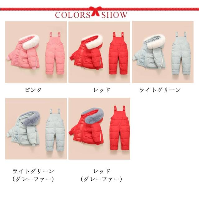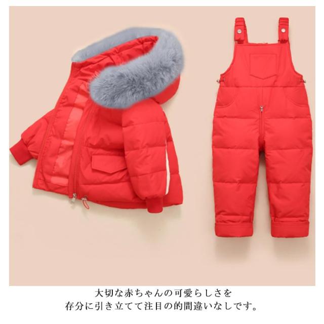 ダウンジャケット ダウンコート+ダウンサロペット ベビー服 キッズ 雪遊び 上下セット 無地 ベビー フード付き 男の子 女の子 ラクーンファー付き 2点セット 100 アウター アウトドア キッズジャケット 子供服 防寒 お出かけ 防寒 冬 70 80 90 ダウン90%
