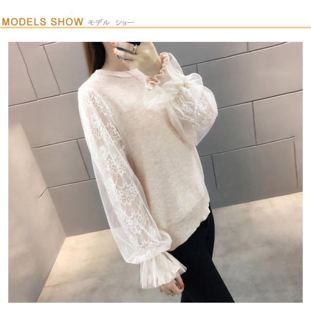 レース リブニット シンプル セーター 細身 ファッション ぽわん袖 クルーネック レディース 春 秋 秋服 冬 丸首 【送料無料】パフ袖 パフ袖 バルーン袖 チュール 無地 もっちり