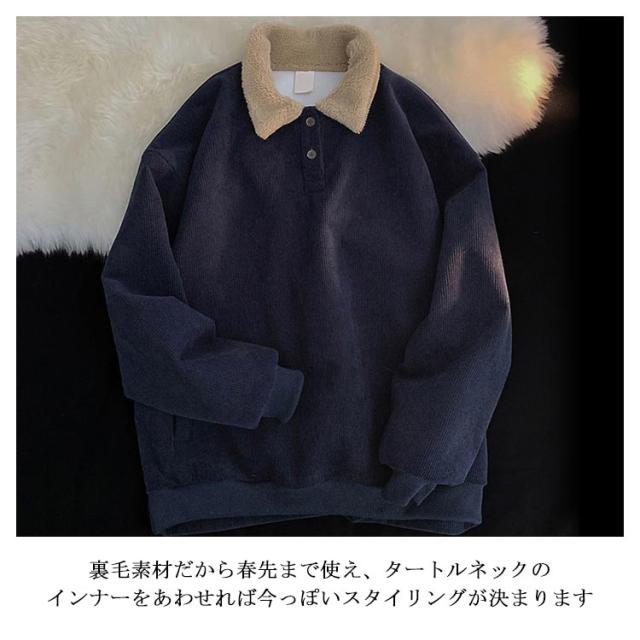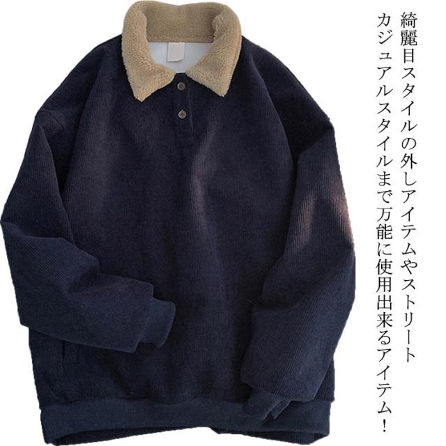 トレーナー 襟付き コーデュロイ ボア襟 スウェット 裏起毛 やや厚手 微起毛 メンズ レディース ゆったり 配色 パーカー ネイビー 紺 ライトベージュ 春 秋冬 ハーフボタン ユニセックス 無地 シンプル