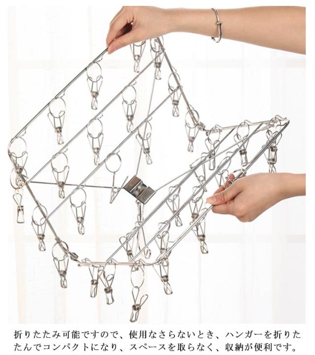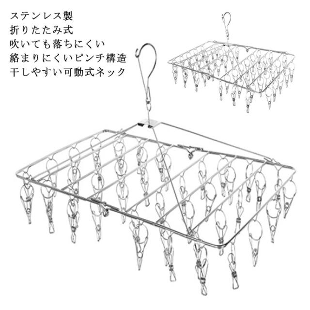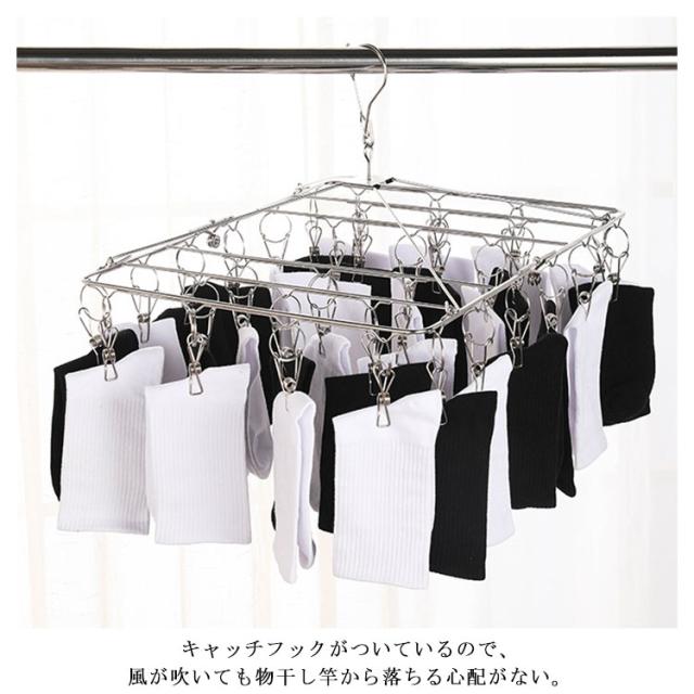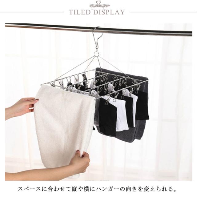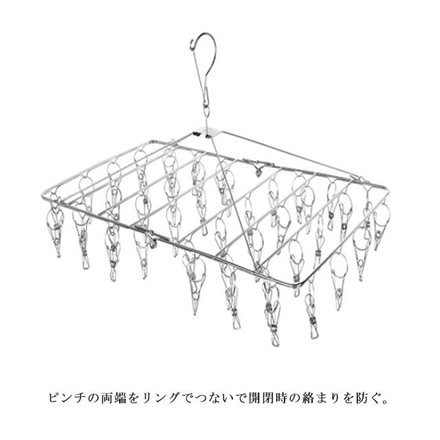 | ステンレス製 フレームもピンチもすべて、ステンレス製だからサビに強く丈夫。 絡まりにくいピンチ構造 ピンチの両端をリングでつないで開閉時の絡まりを防ぐ。 吹いても落ちにくい キャッチフックがついているので、風が吹いても物干し竿から落ちる心配がない。 干しやすい可動式ネック スペースに合わせて縦や横にハンガーの向きを変えられる。 折りたたみ式 折りたたみ可能ですので、使用なさらないとき、ハンガーを折りたたんでコンパクトになり、スペースを取らなく、収納が便利です。 | |