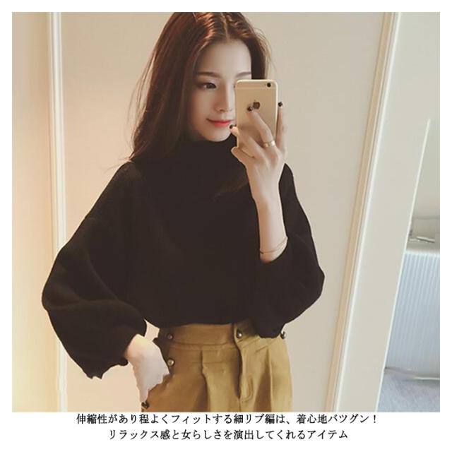 セーター ハイネック 秋 冬 レディース 秋冬 トップス ニット チュニック 長袖 春 タートルネック ニットセーター リブ バルーン袖 ボリューム袖 グレー 黒 白 7分袖