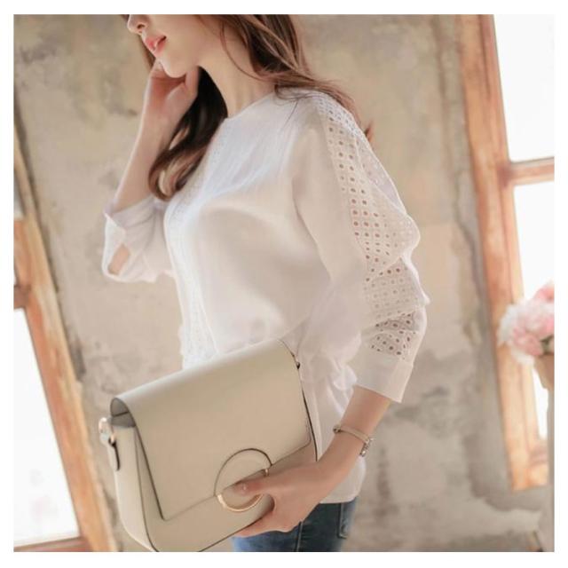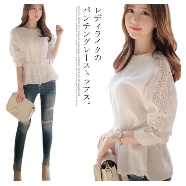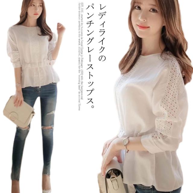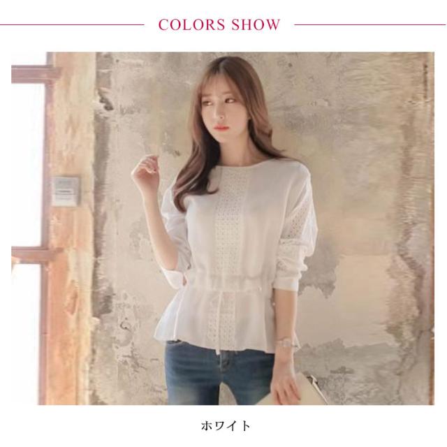 長袖シャツ パンチングレース 丸首 ゆる ウェスト紐 通勤 送料無料 レディース シアー 通勤 トップス ドルマンスリーブ ブラウス