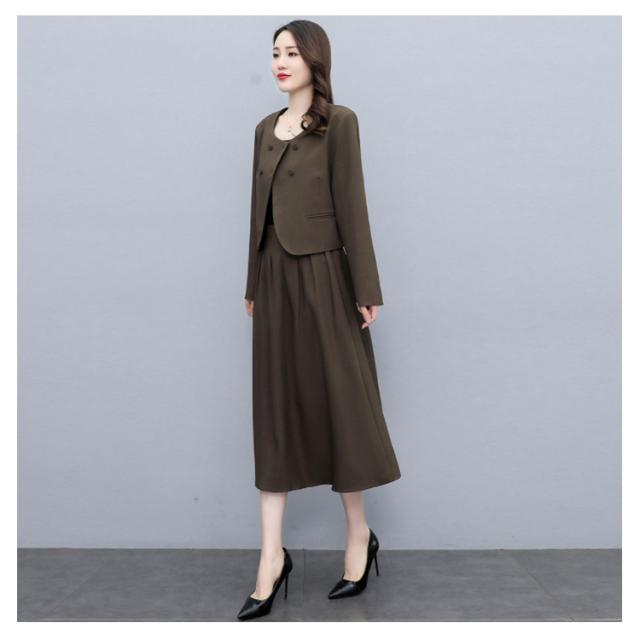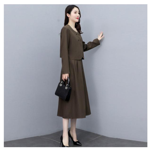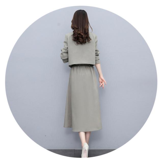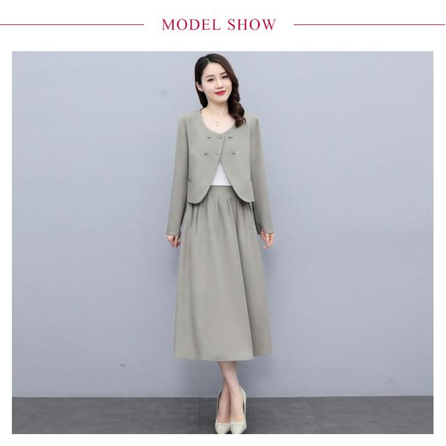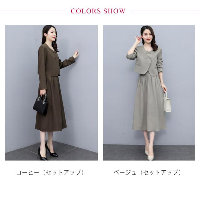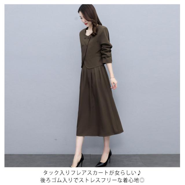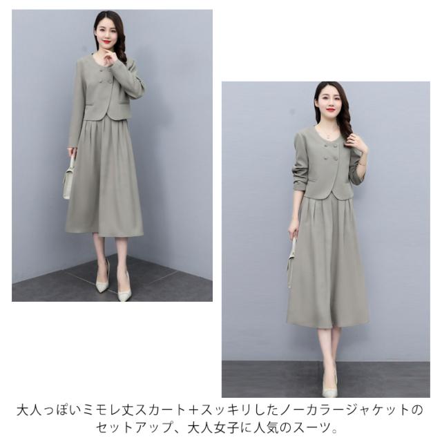 | 結婚式・入学式・卒業式・入園式・卒園式などフォーマルシーンに活躍するスカートスーツ。 大人っぽいミモレ丈スカート+スッキリしたノーカラージャケットのセットアップ、大人女子に人気のスーツ。 セレモニーからタウンまでオールシーズン活躍する万能スタイル。 セットではもちろん、単品使いも着まわし力抜群。 タック入りフレアスカートが女らしい♪後ろゴム入りでストレスフリーな着心地◎ | |