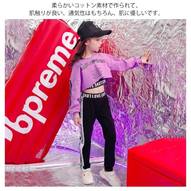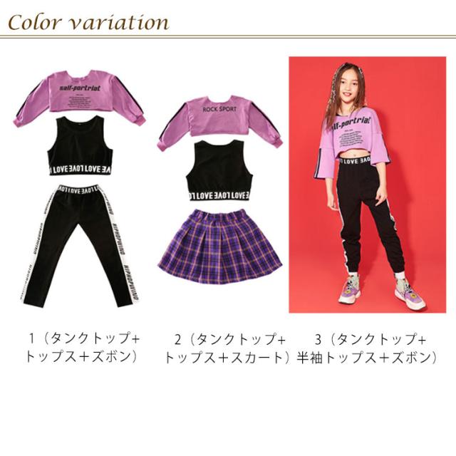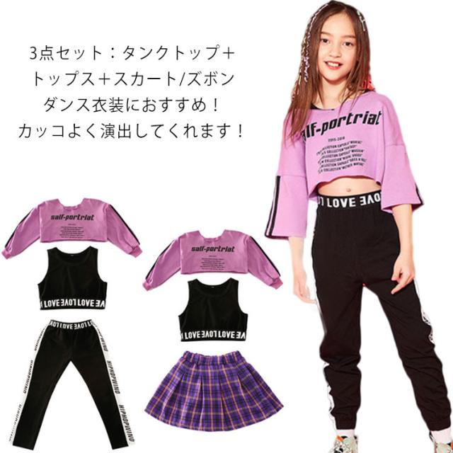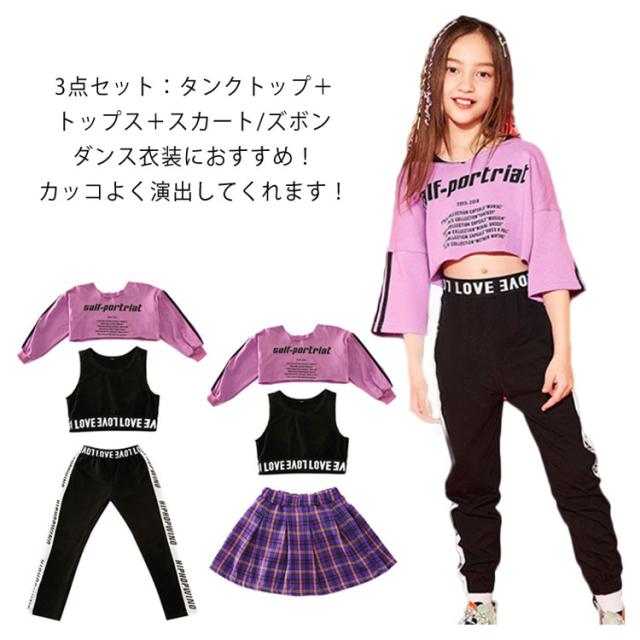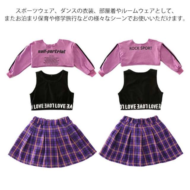 ヒップホップ トップス HIPHOP キッズ チア衣装 チェック 半袖 長袖 練習着 ダンス衣装 タンクトップ パープル ミニスカート ガールズ ズボン サルエルパンツ チア ステージ衣装 セットアップ 子供服 おしゃれ 日常着 ダンスウェア 3点セット