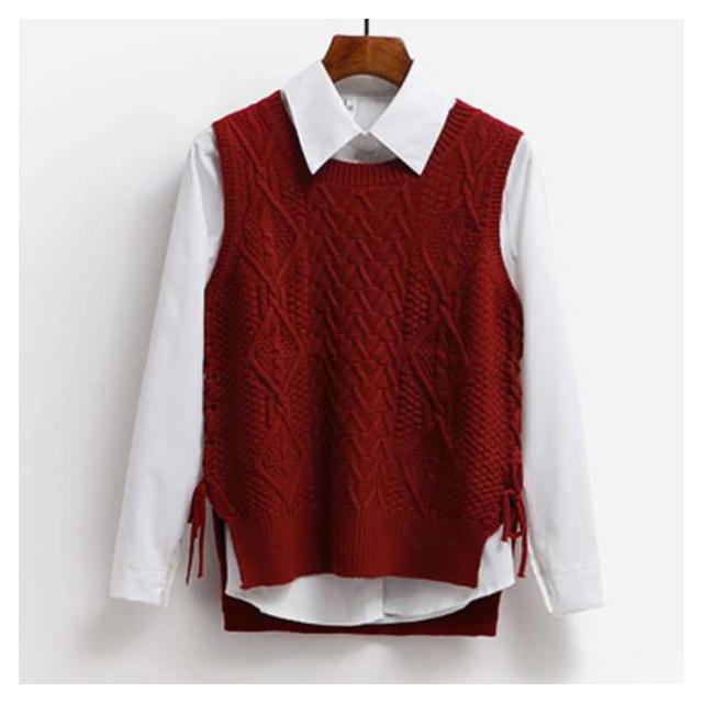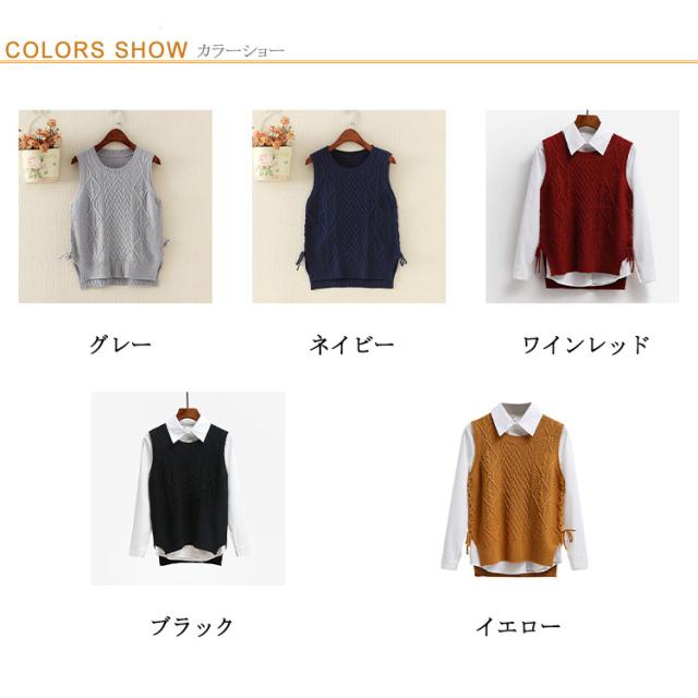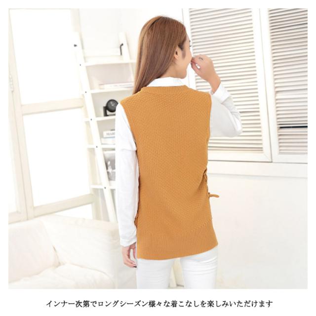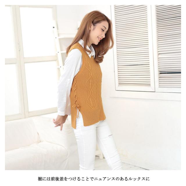 【送料無料】サイドスリット ニットベスト ケーブル編み クルーネック レディース 春 夏 冬 丸首 無地 チョッキ サイドリボン 通学 通勤 レイヤード 重ね着 コーデ 大人可愛い 20代 30代 40代 50代 ネイビー 紺
