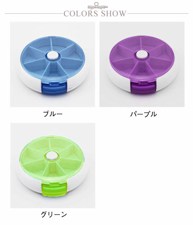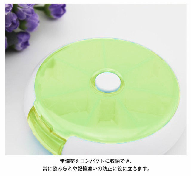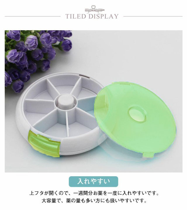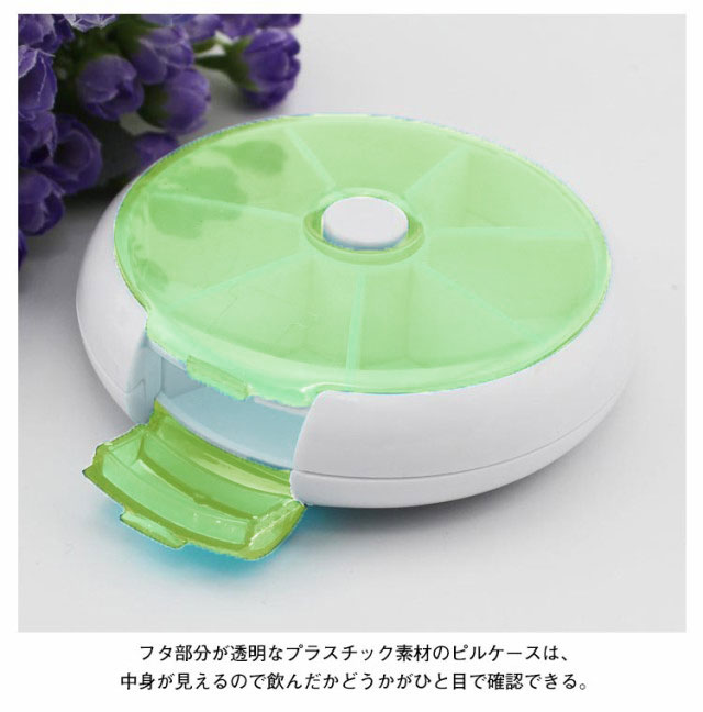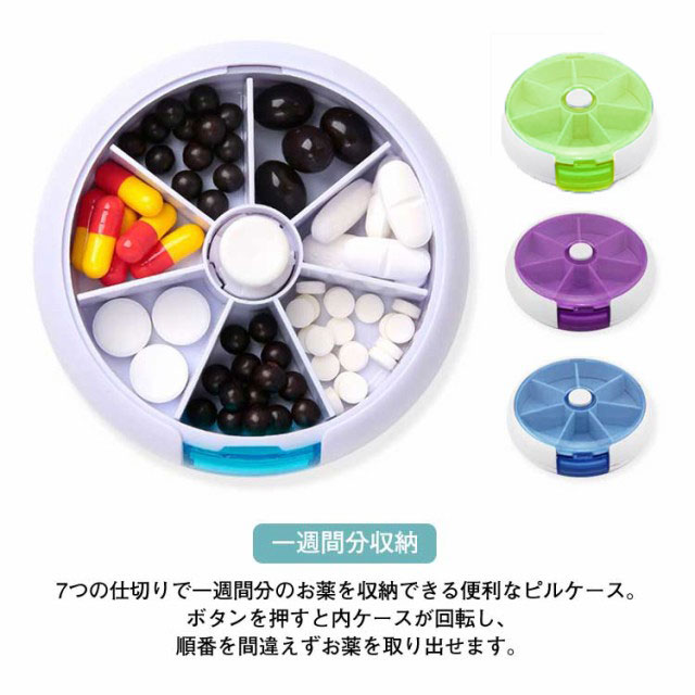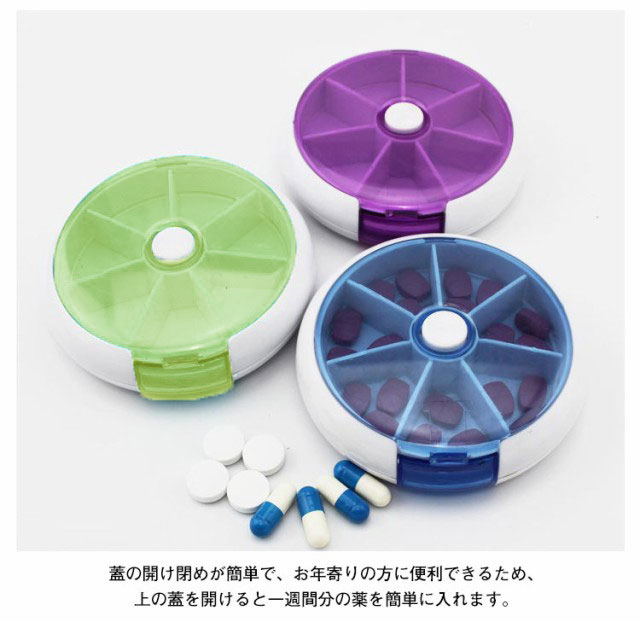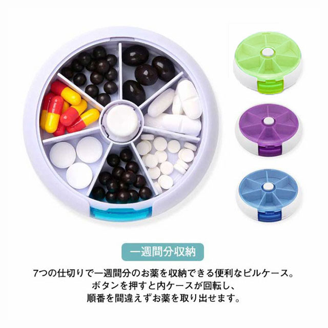 | 一週間分収納 7つの仕切りで一週間分のお薬を収納できる便利なピルケース。ボタンを押すと内ケースが回転し、順番を間違えずお薬を取り出せます。 入れやすい 上フタが開くので、一週間分お薬を一度に入れやすいです。大容量で、薬の量も多い方にも扱いやすいです。 蓋の開け閉めが簡単で、お年寄りの方に便利できるため、上の蓋を開けると一週間分の薬を簡単に入れます。 常備薬をコンパクトに収納でき、常に飲み忘れや記憶違いの防止に役に立ちます。 フタ部分が透明なプラスチック素材のピルケースは、中身が見えるので飲んだかどうかがひと目で確認できる。 携帯便利なコンパクトサイズ 角が取れたデザインでポケットや鞄に入れて持ち歩きしやすいです。ほかの荷物を傷つける心配もありません。旅行や出張はもちろん、普段生活での会社や学校などにもオススメの携帯ピルケース。お薬を入れたピルケースは直射日光、高温多湿の場所に離れてください。 | |
