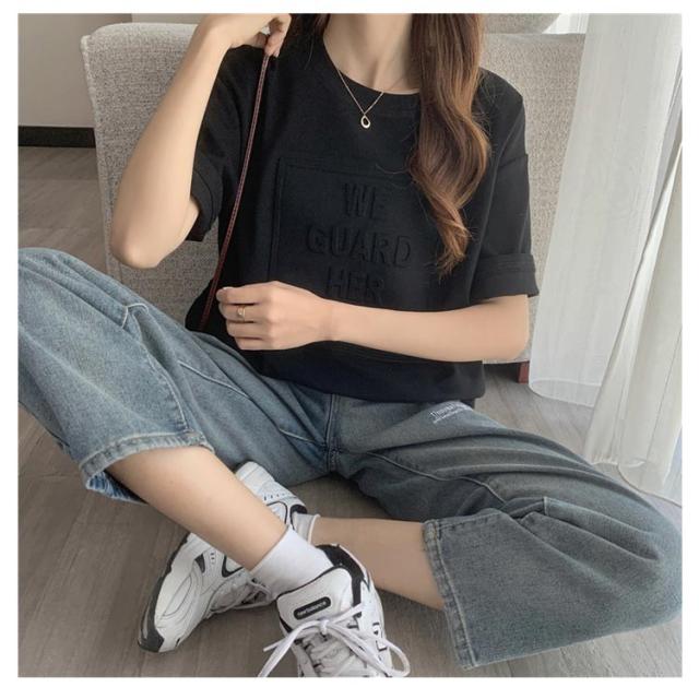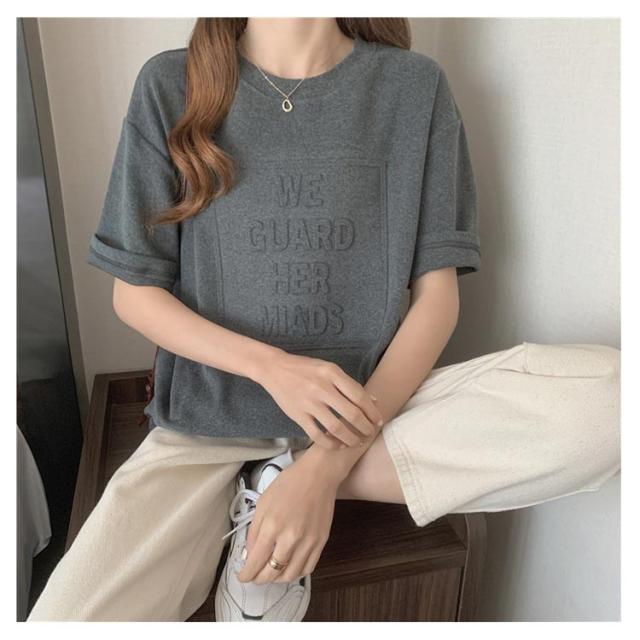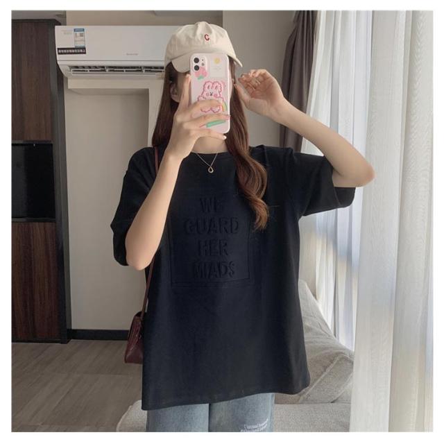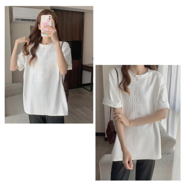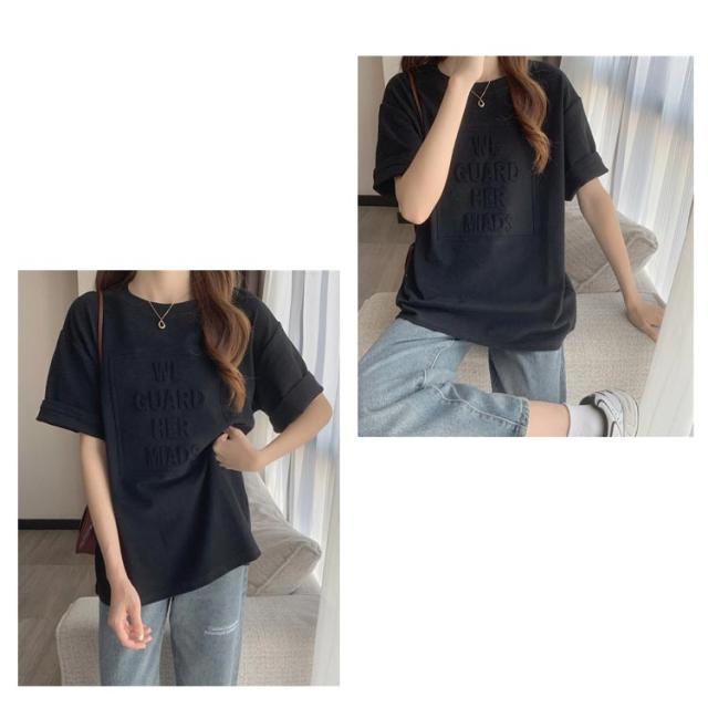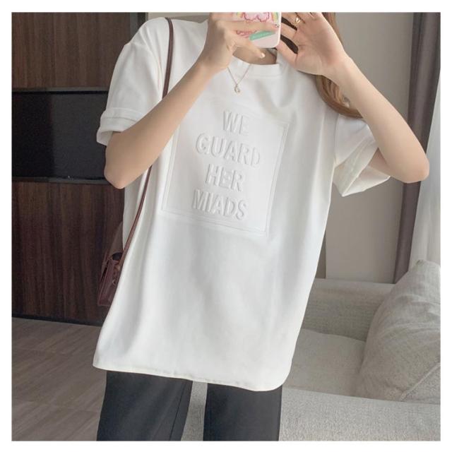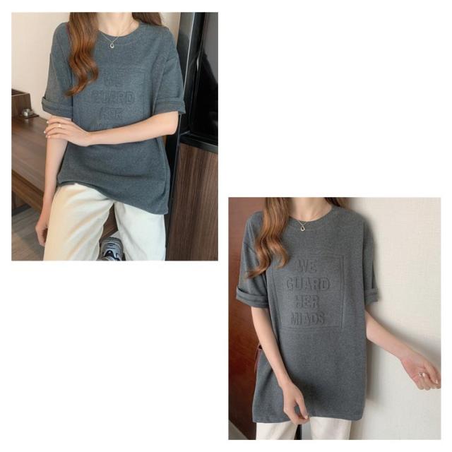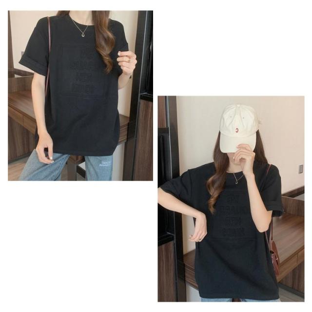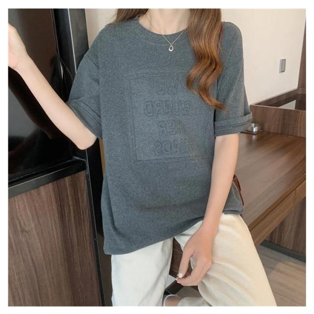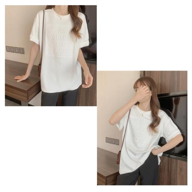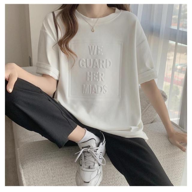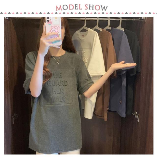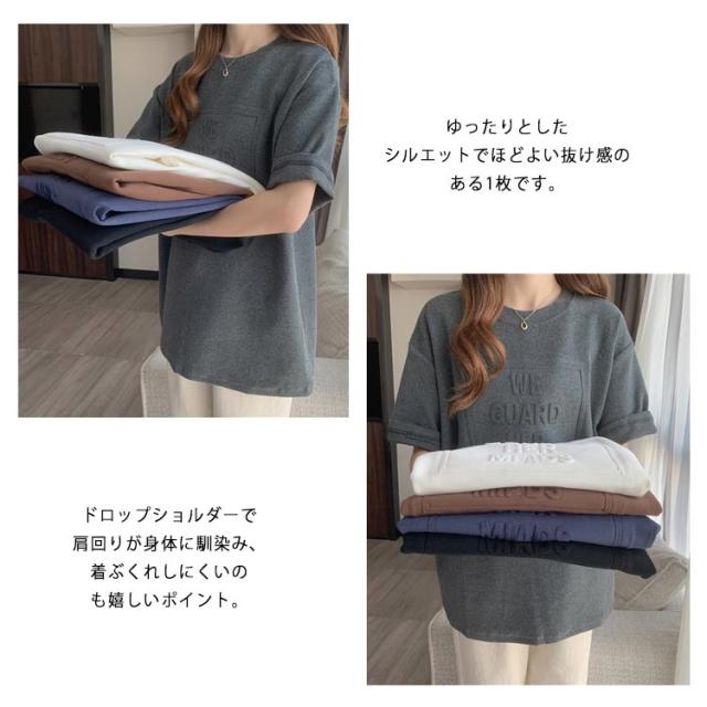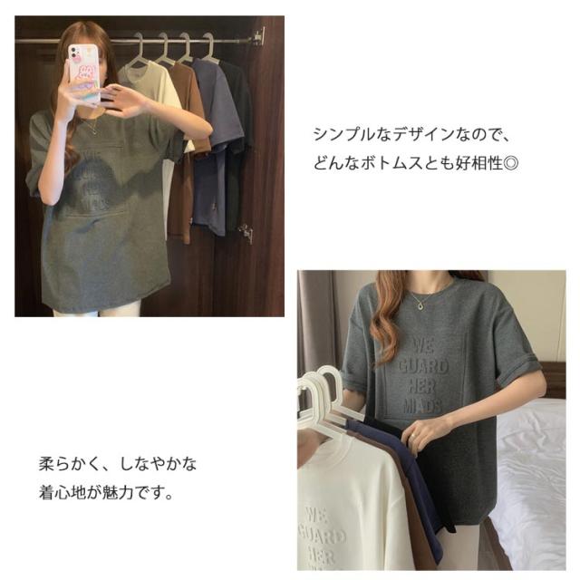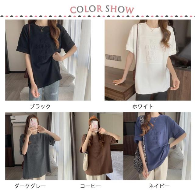 Tシャツ レディース 半袖 五分袖 tシャツ ロゴ エンボス加工 トップス Uネック ロング カットソー おしゃれ ゆったり ドロップショルダー 大きいサイズ インナーウェア シンプル カジュアル 女性用 肌着 ジョギング 部活 ダンス 衣装 夏 春 夏服 送料無料