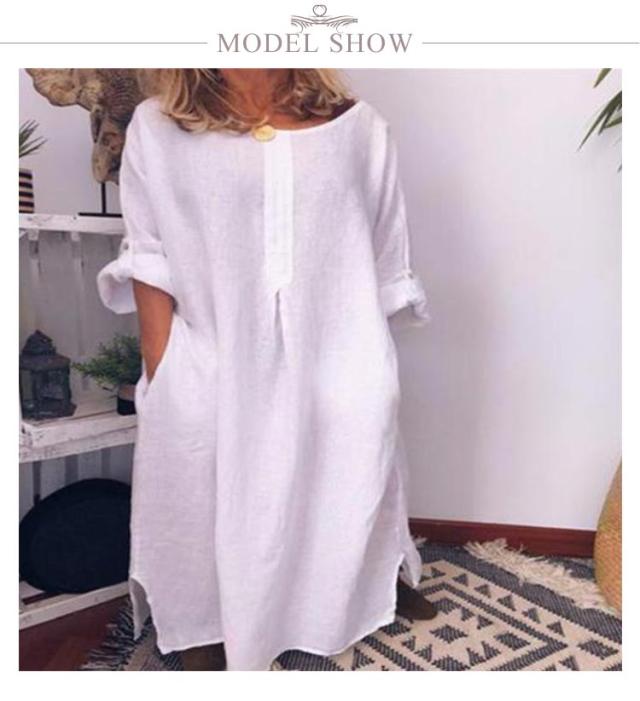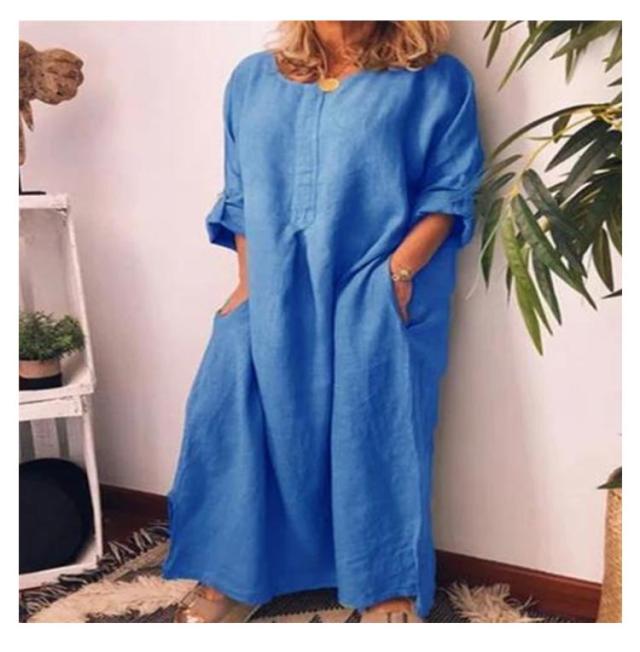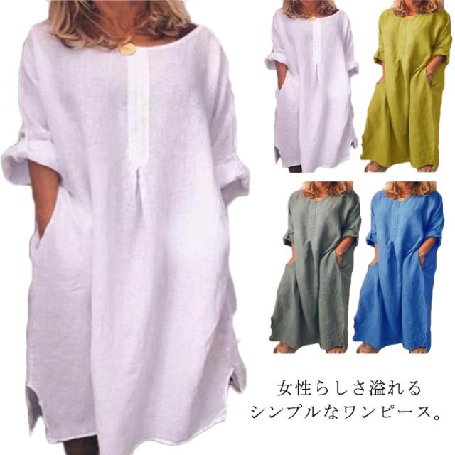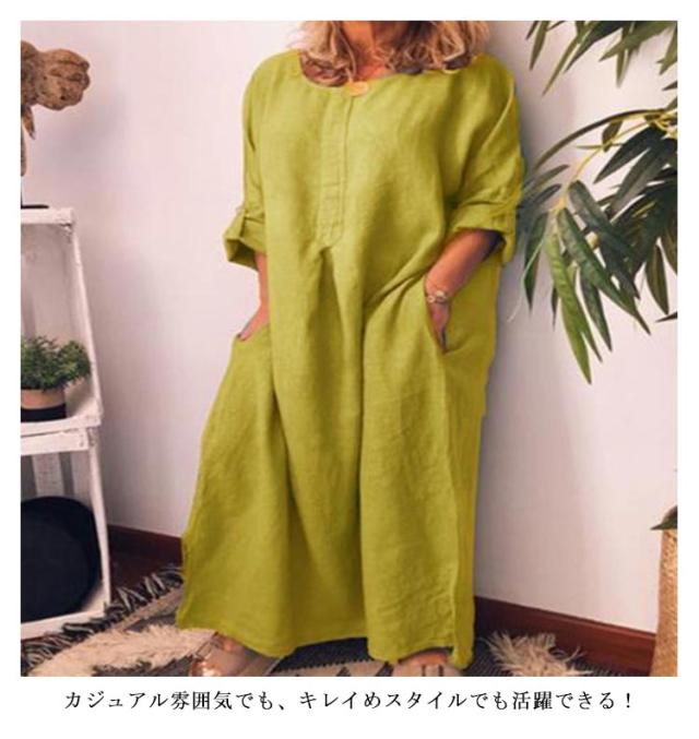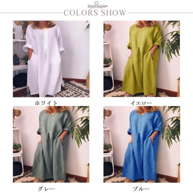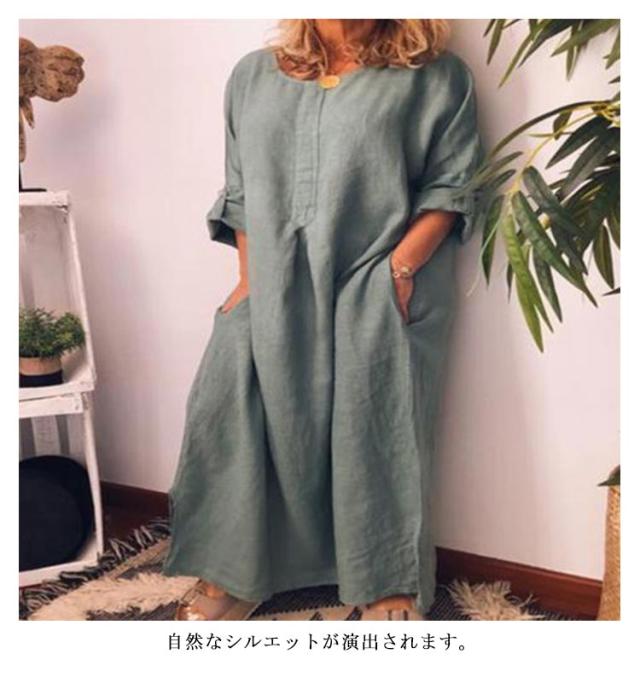 Cotton linen dress ロングワンピース レディース ワンピース 半袖 五分袖 ロング丈ワンピース 綿麻 コットンリネン ロングワンピ 夏 麻混 無地 マキシワンピース サイトポケット