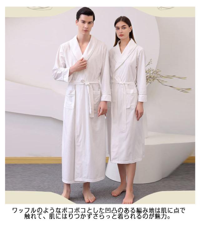 | ワッフル生地のホテル仕様、リッチ感あるのバスローブになります。 風呂上がりのルームウエアからホテルや旅館のバスローブまで最適! ウエスト部分は取り外し可能なベルトつきで調節可能になっています。 ワッフルのようなポコポコとした凹凸のある編み地は肌に点で触れて、肌にはりつかずさらっと着られるのが魅力。 あると便利なサイドポケットで実用的。シルエットを邪魔しないところも。 シンプルなデザインで年代問わず男女兼用でペアルックにもオススメです。 サッと着れるのであわただしい、小さなお子さまとのバスタイムにもとても便利。 | |