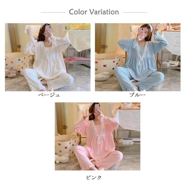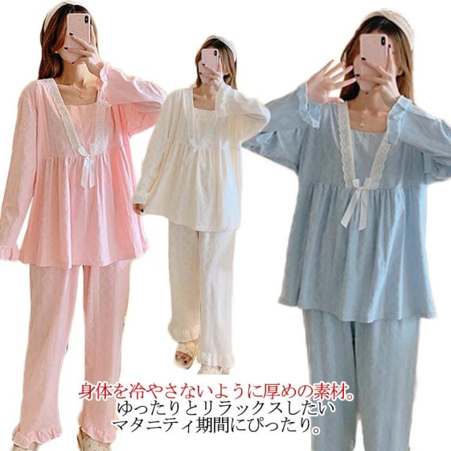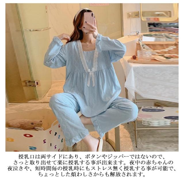 送料無料 マタニティ パジャマ ネグリジェ 長袖 授乳口付き 前開き 上下セット 授乳口付きマタニティー パジャマ レース 長袖 前開き かわいい おしゃれ レディース 授乳 パジャマ 春夏〜夏 M〜2XLサイズ(大きいサイズ)マタニティ パジャマ