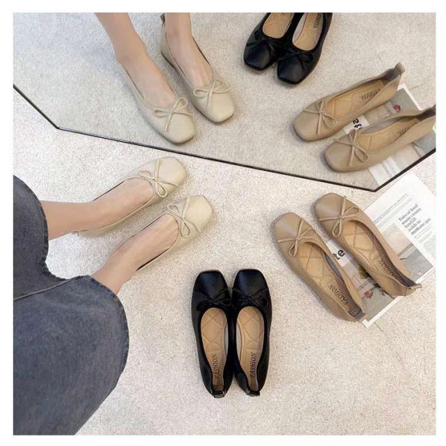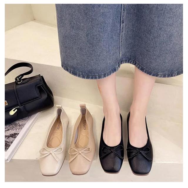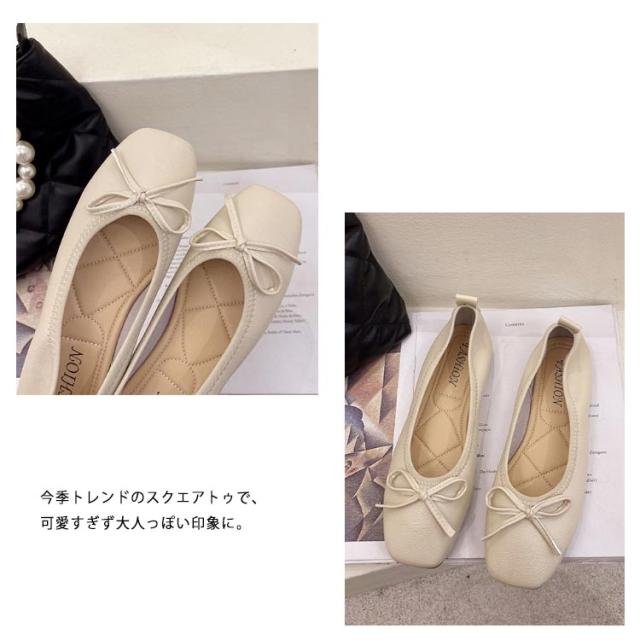送料無料 パンプス スクエアトゥバレエシューズ バレエシューズ バレエ ぺたんこ フラットシューズ レディース スクエアトゥ リボン 柔らかい 3e ブラック ベージュ
